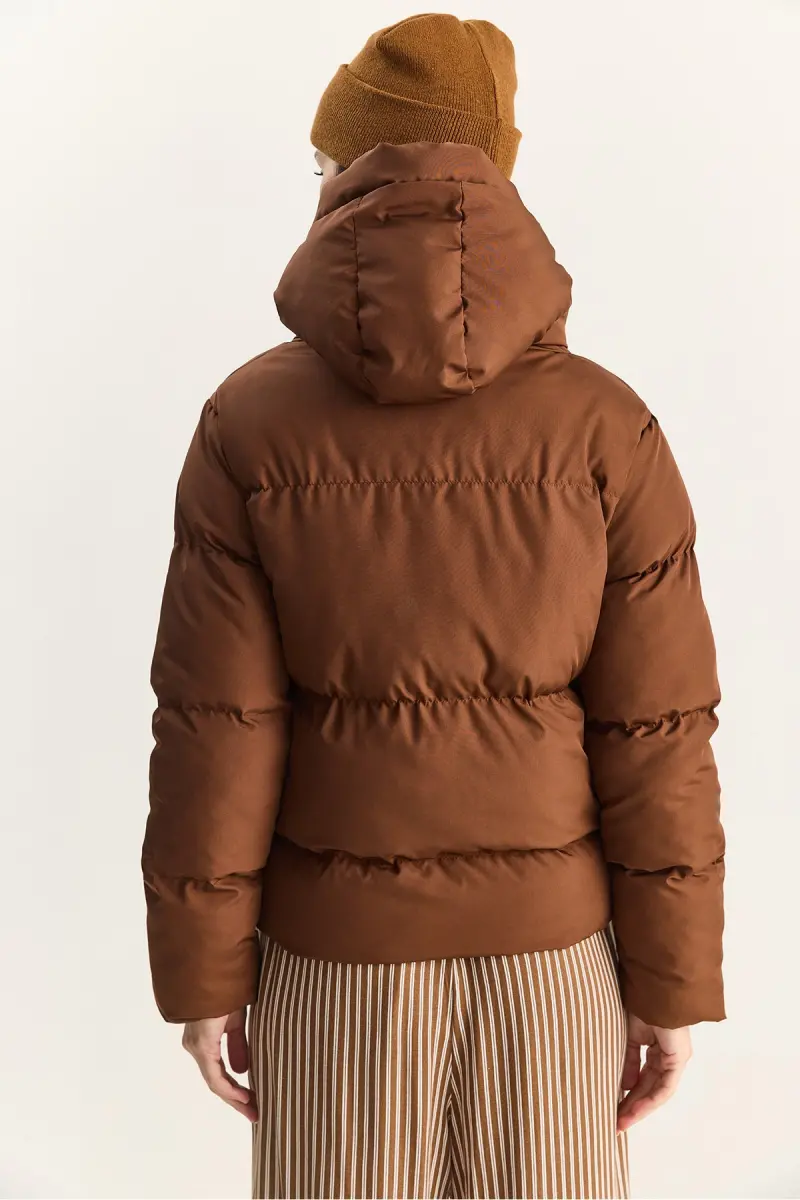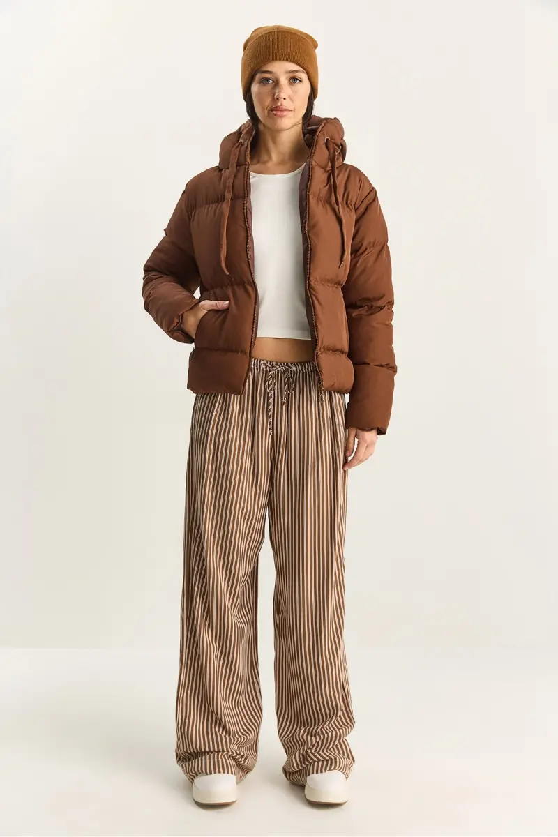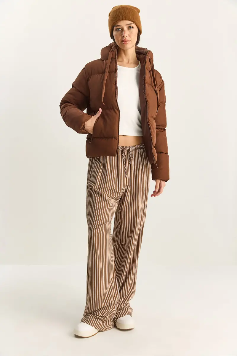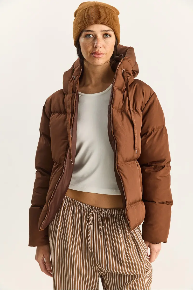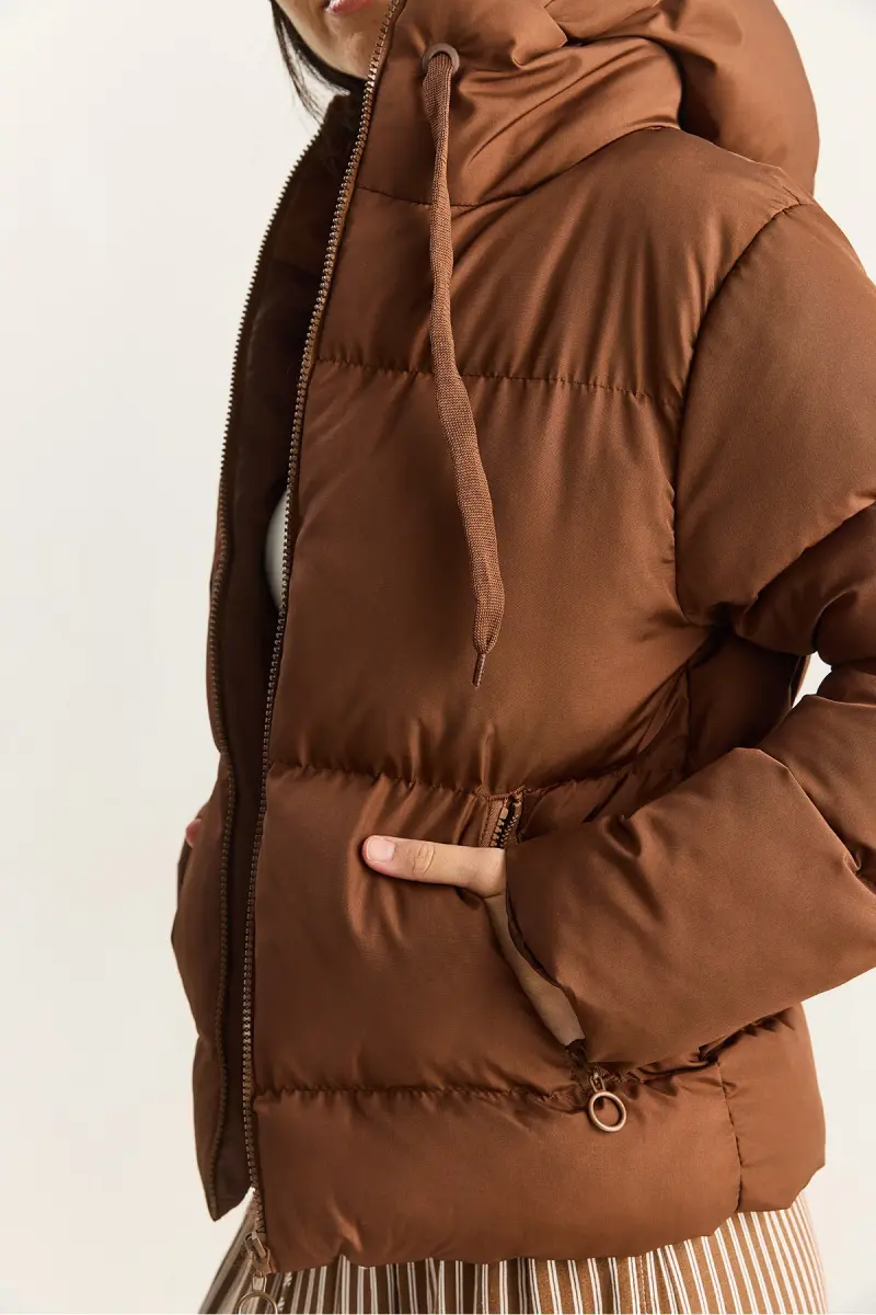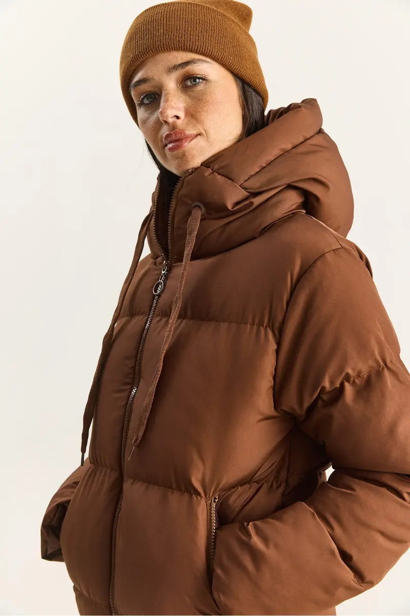 Kadın Kapüşonlu Şişme Mont-Açık Kahve