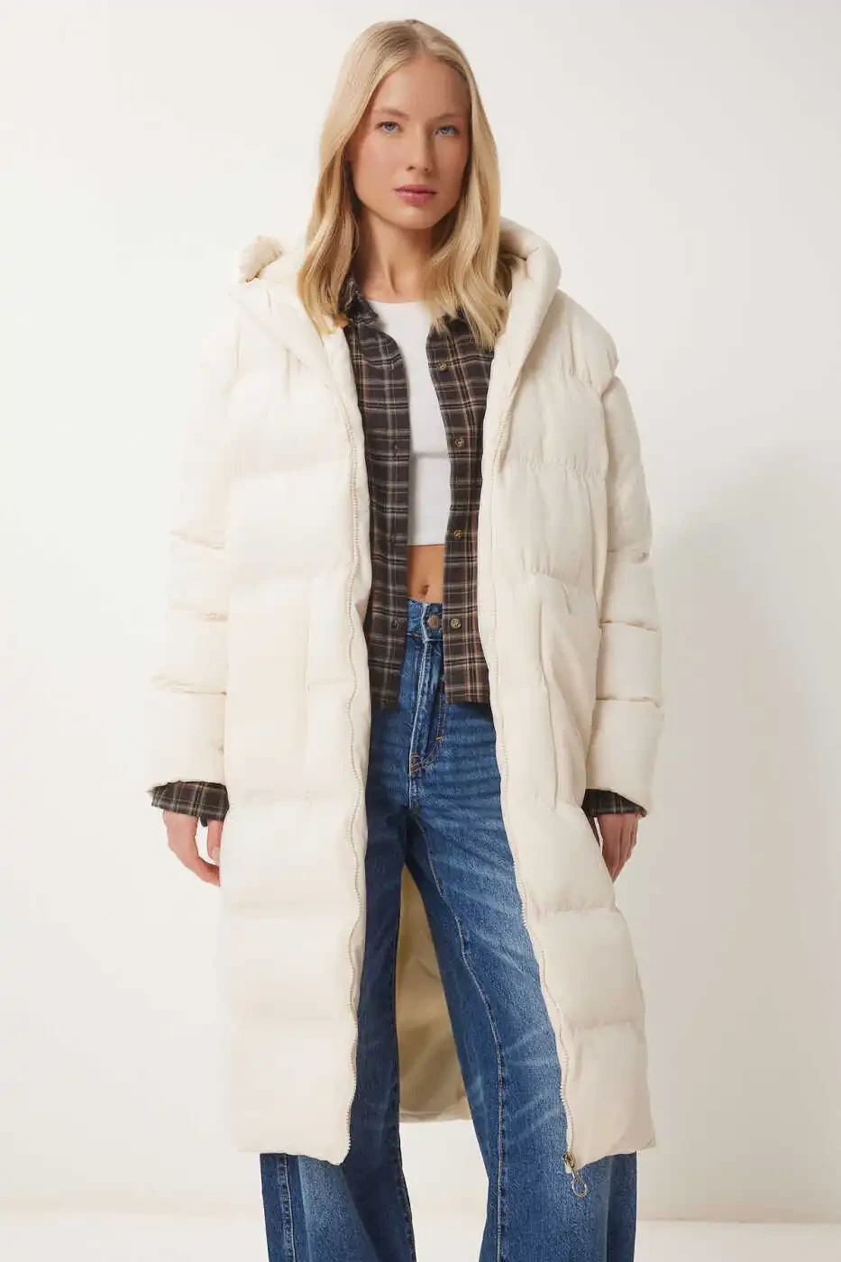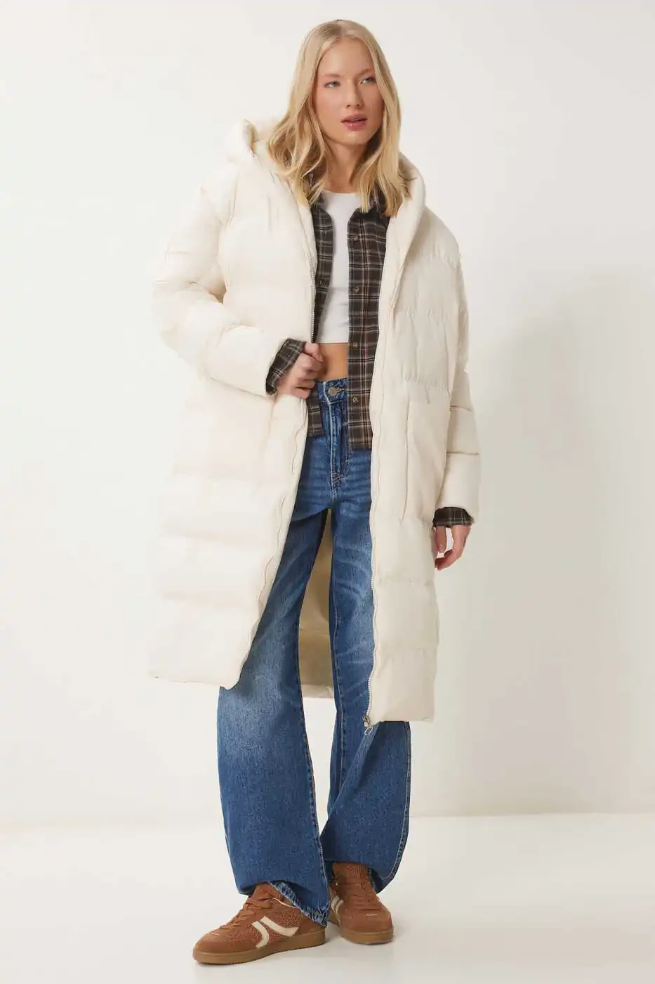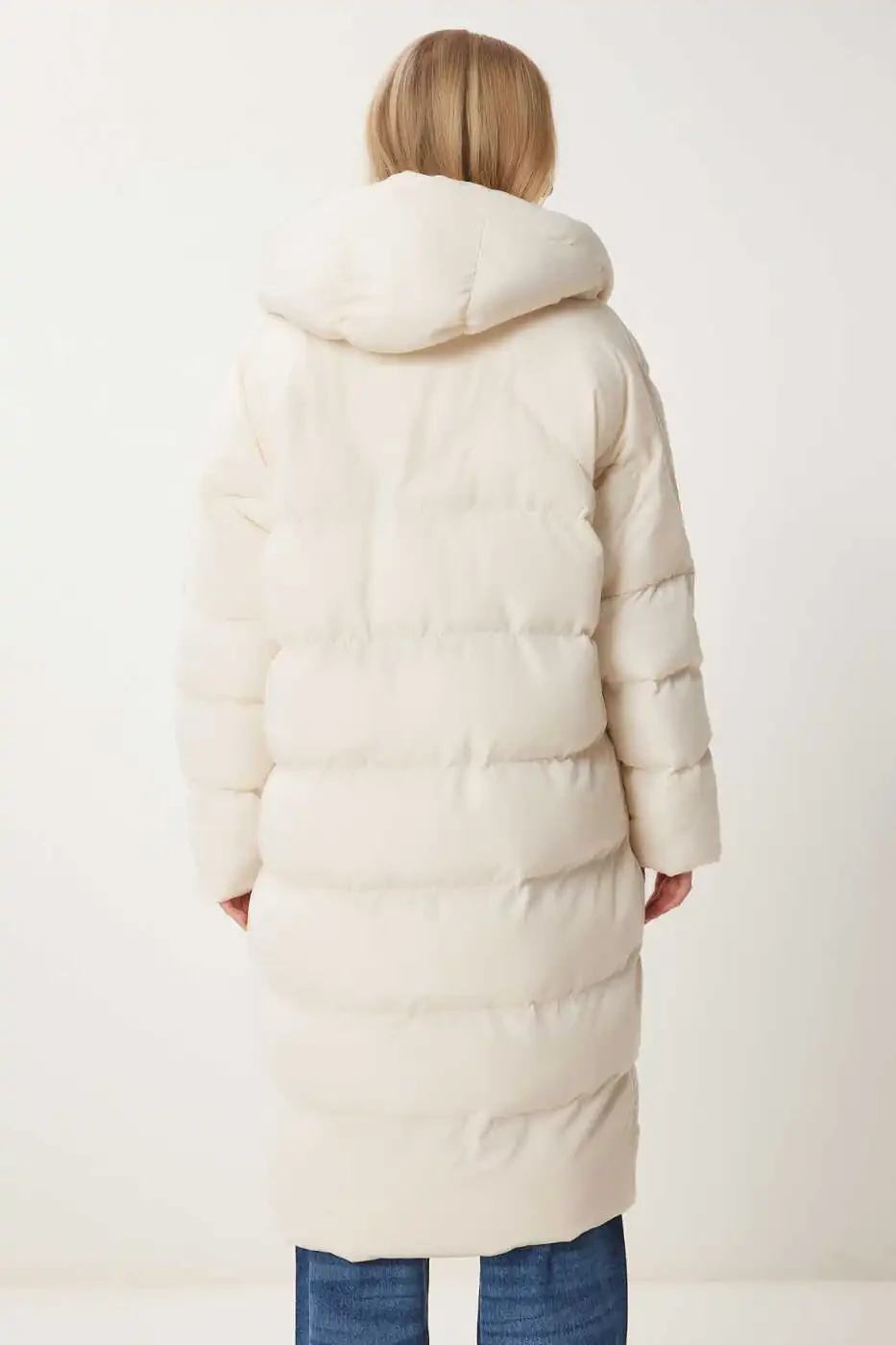 Stay stylish and warm in cold weather with the Women's Bone Hooded Oversize Long Puffer Coat NT00428. This coat will be an indispensable part of your wardrobe with its oversize cut that offers a modern and comfortable look, functional hood, and useful pockets. Thanks to its 100% polyester fabric, it provides superior protection against the cold, while its lined structure offers a comfortable use experience all day long. Its low-shoulder design and wide cut emphasize your elegance without restricting your freedom of movement. This coat is a perfect option for both daily use and special occasions. You can easily combine it with your jeans, leggings, or dresses and add a different touch to your style. The front pockets allow you to safely carry your phone, keys, or other small items. The hood protects your head and neck in cold weather, protecting you from wind and rain. The bone color offers ease of combination by harmonizing with all kinds of clothes. Thanks to its oversize cut, you can achieve a layered look by wearing thick sweaters or sweatshirts inside. This coat not only keeps you warm, but also reflects your style. Our product is shipped by Trendyol and is offered at a campaign price. Order now to avoid missing this product, which is available in limited quantities. Remember, a product can be sold by more than one seller. By comparing the prices, ratings, delivery statuses, and promotions of different sellers, you can evaluate the option that suits you best. You can order a maximum of 10 of this product. Orders over 10 units may be canceled by Trendyol. Different limits may be set for corporate orders. If you are not satisfied with the product, you have the right to return it free of charge within 15 days. You can review the return conditions for detailed information. Model Measurements: Height: 1.73 cm, Bust: 79 cm, Waist: 60 cm, Hips: 90 cm. Product Length: 105 cm, Sleeve Length: 65 cm. Colors may vary due to light differences in studio shots. Enjoy the cold weather with this stylish and useful puffer coat!