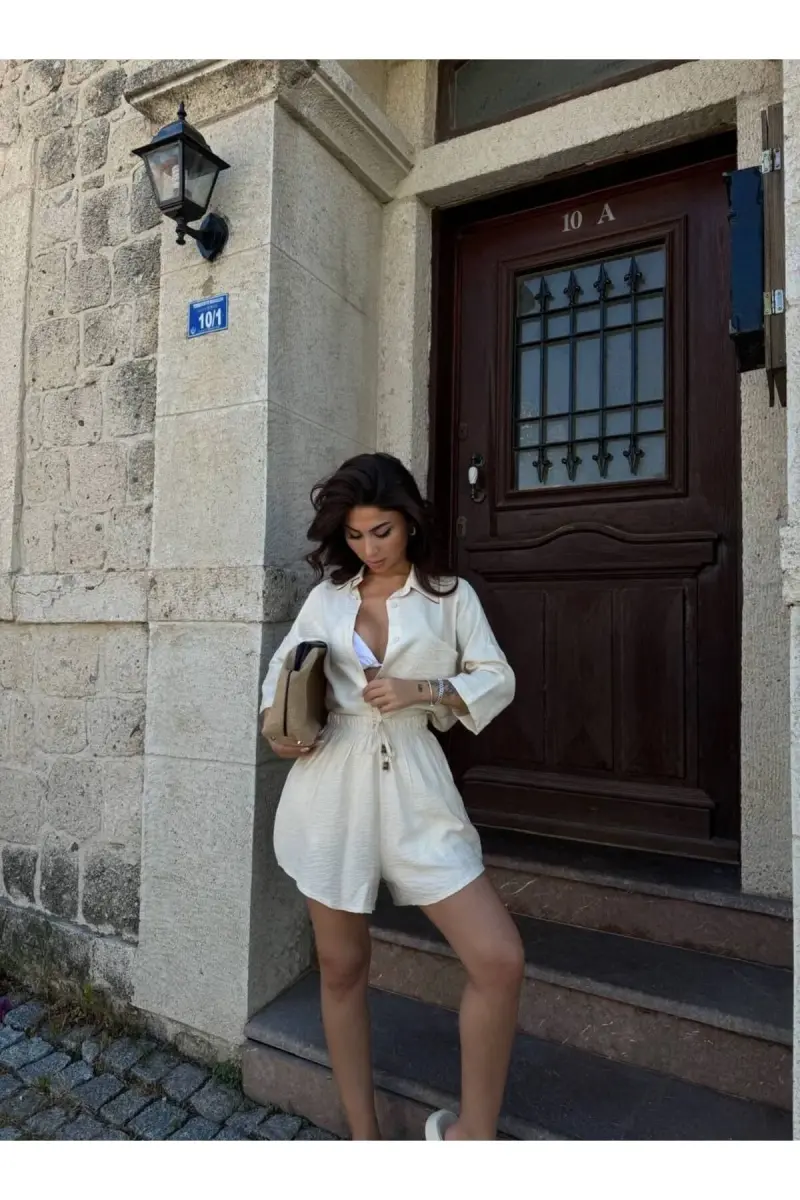 Kadın Keten Görünümlü Kumaş Oversize Gömlek Şort Takımı-Açık Krem