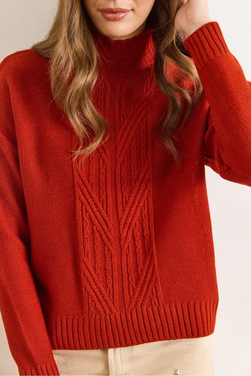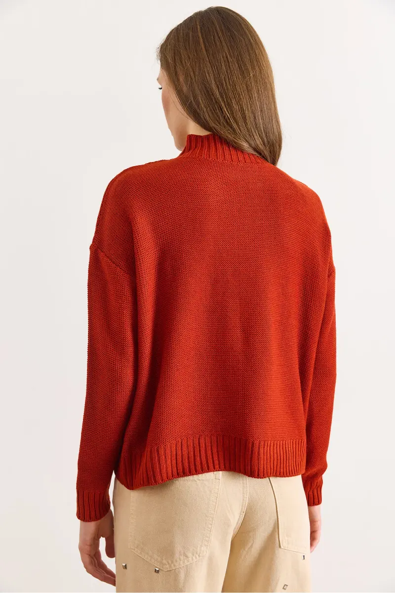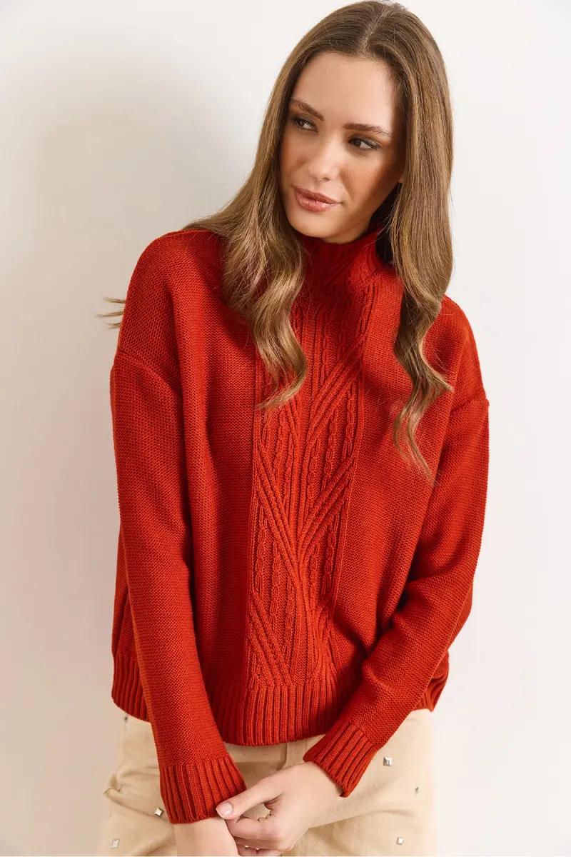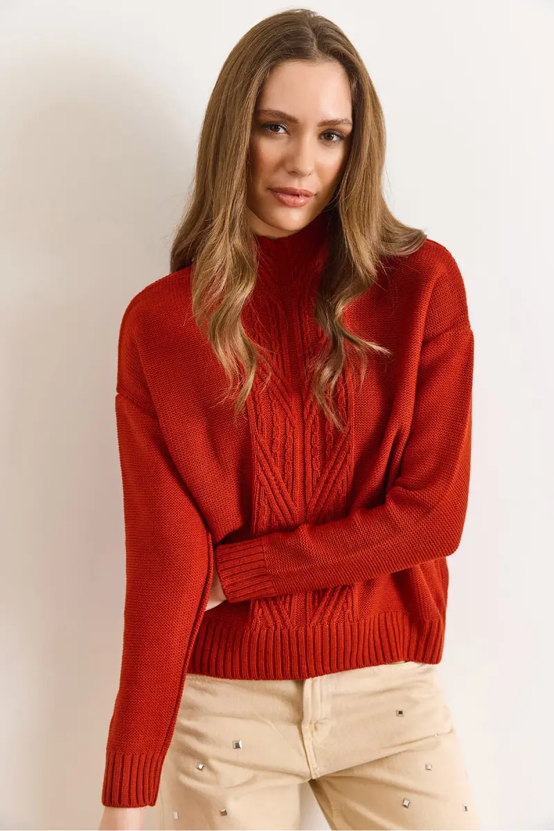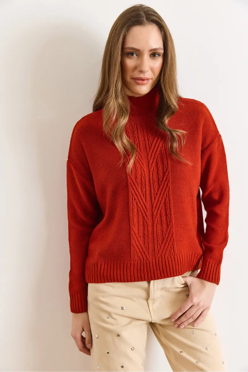 Kadın Kiremit Dik Yaka Ortası Saç Örgülü Triko Kazak KZK-19000912-Kiremit