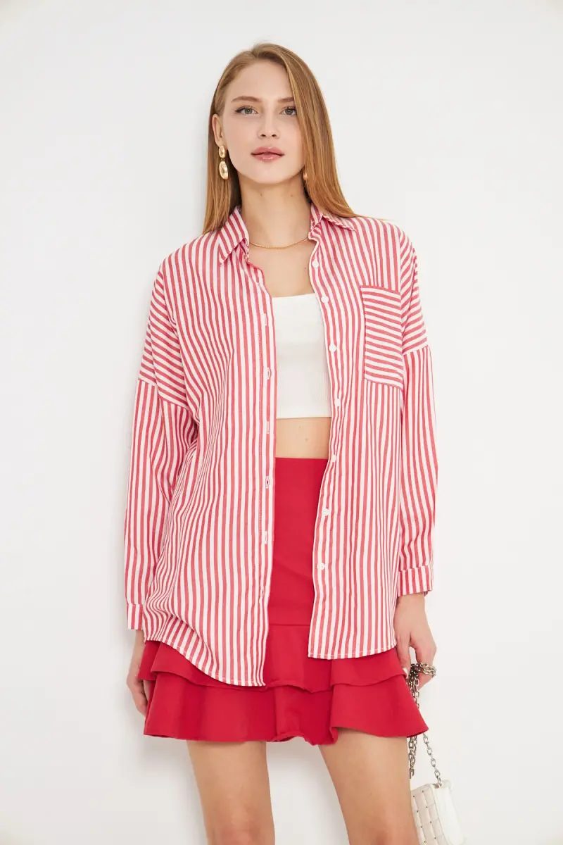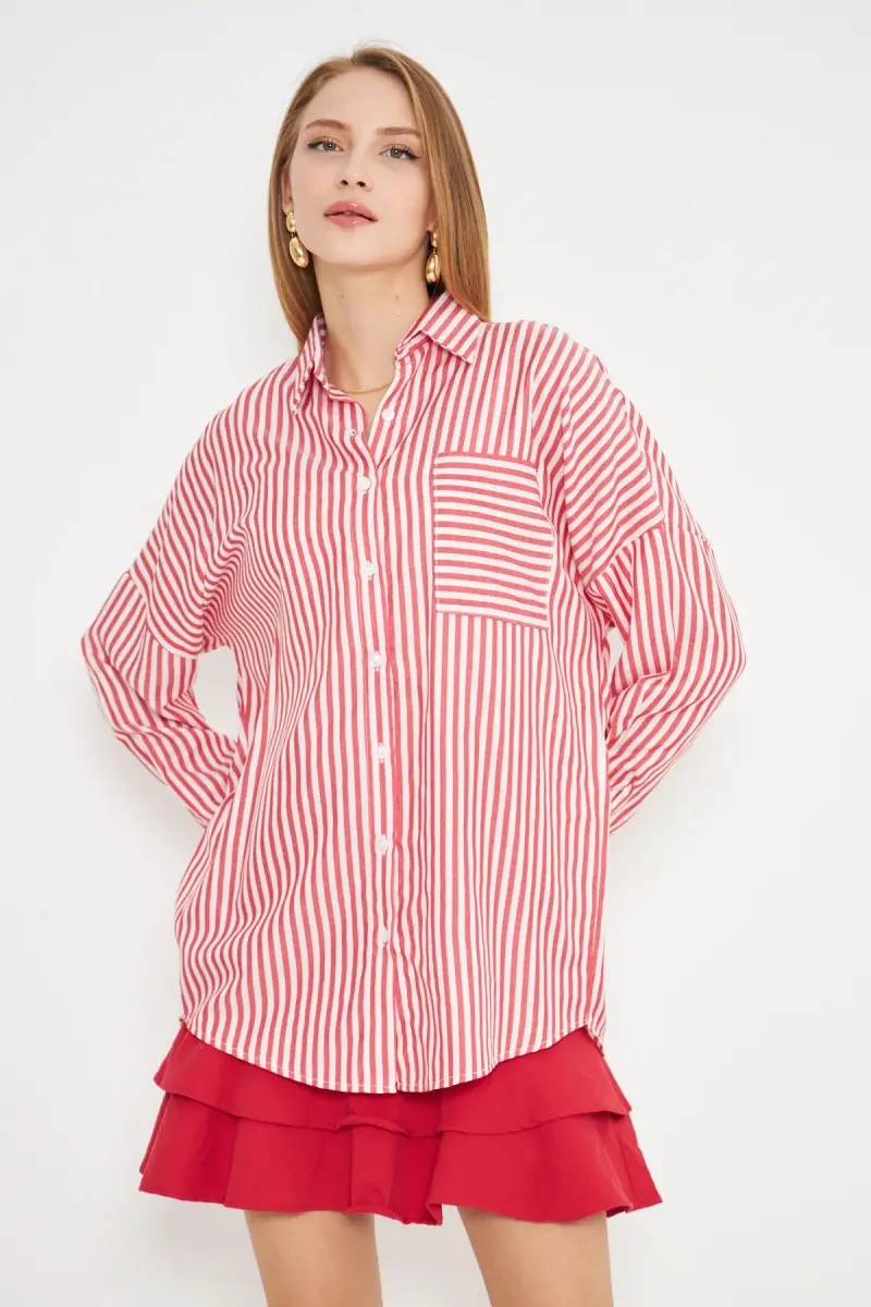 Kadın Kırmızı Çizgili Uzun Kol Cep Detaylı Sırtı Pileli Oversize Gömlek ARM-25K001069-Kırmızı
