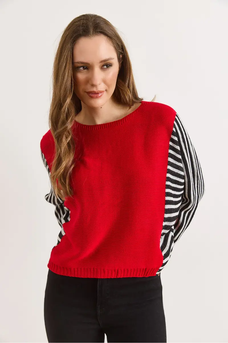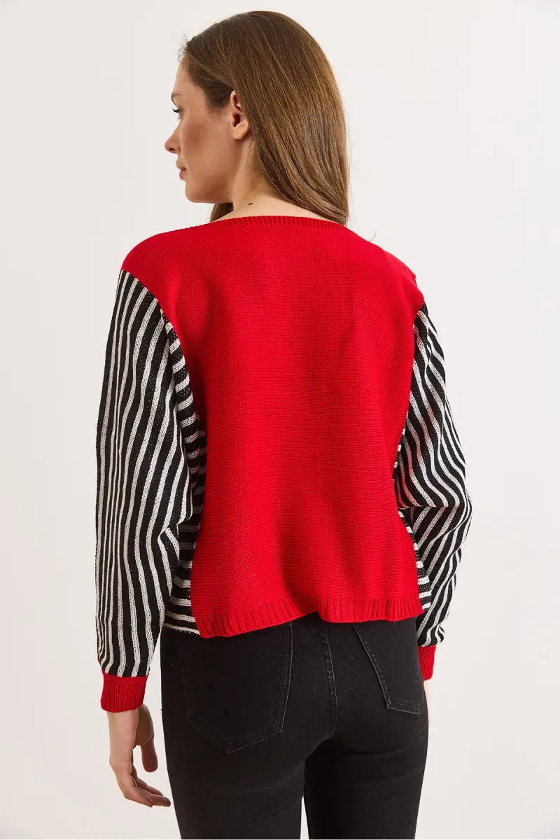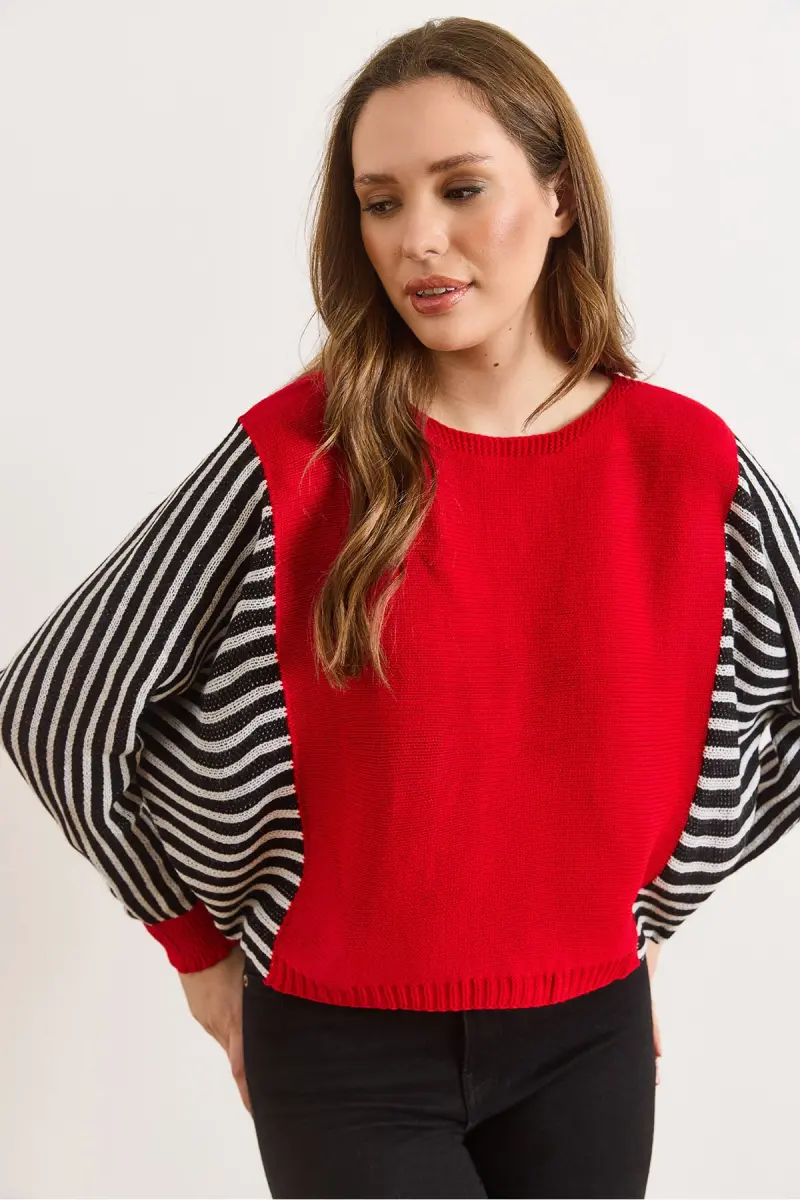Kadın Kırmızı Kol Detaylı Triko Kazak KZK-19000817-Kırmızı