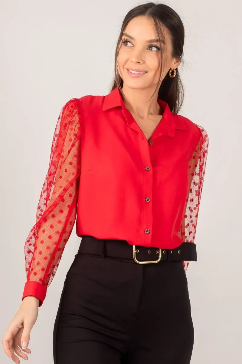 Kadın Kırmızı Kolları Tül Gömlek Arm-20K001068-Kırmızı