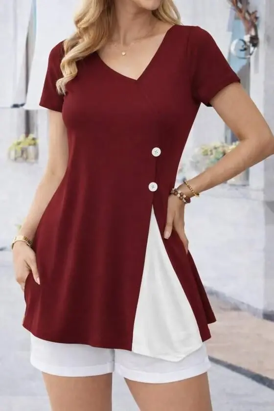Kadın Kısa Kollu Asimetrik V Yakalı Düğme Detaylı Viskon Bluz