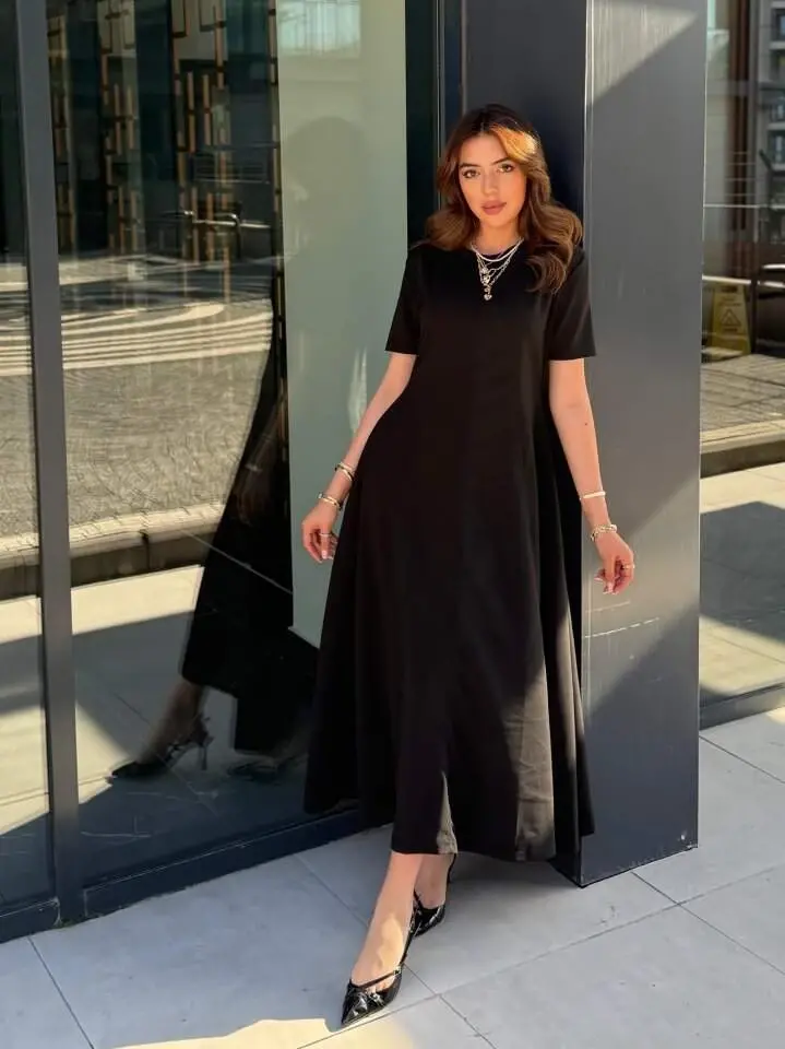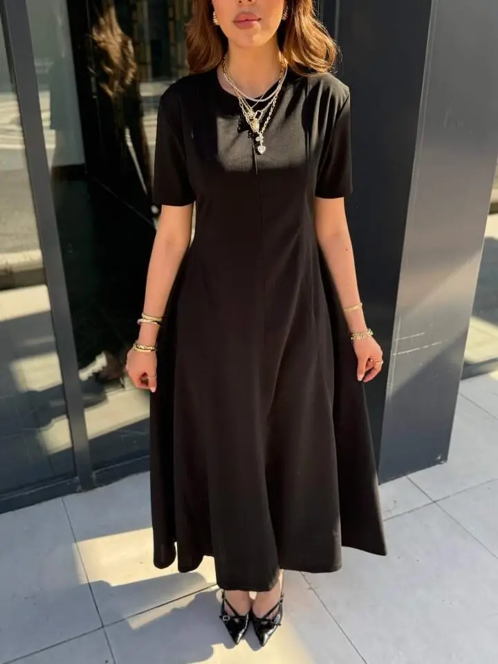 Kadın Kısa Kollu Bisiklet Yaka Maksi Boy Ithal Krep Elbise
