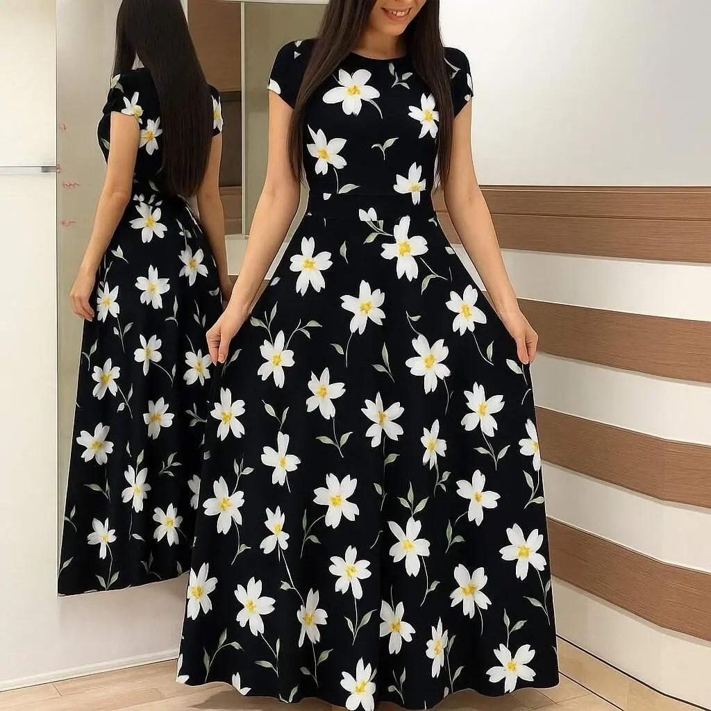 Kadın Kısa Kollu Bisiklet Yaka Puantiyeli Maksi örme Krep Elbise