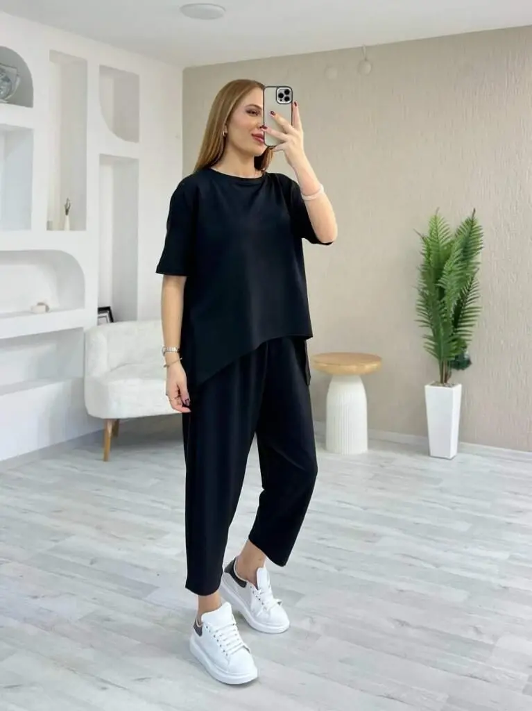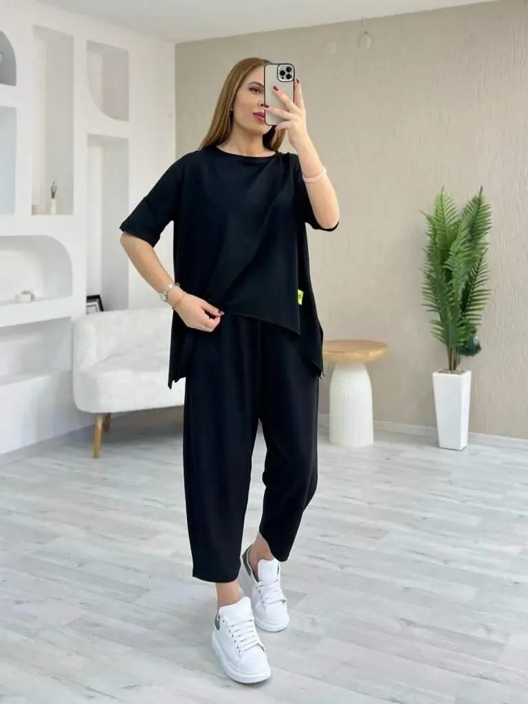 Kadın Kısa Kollu Bisiklet Yaka Viskon Iki Iplik Bluz Ve Pantolon Ikili Takım