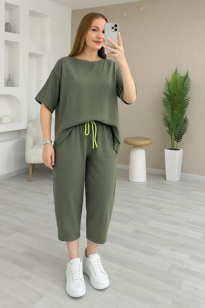 Kadın Kısa Kollu Bisiklet Yaka Viskon Iki Iplik Bluz Ve Pantolon Ikili Takım