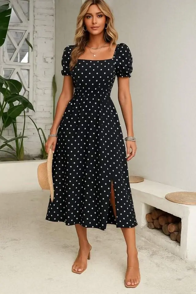 Kadın Kısa Kollu Geometrik Yaka Yırtmaçlı Puantiyeli Midi Örme Krep Elbise ile şıklığı ve rahatlığı bir arada yaşayın. Bu özel tasarım elbise, hem günlük kullanım hem de özel davetler için mükemmel bir seçenek sunuyor. Geometrik yaka detayı, elbiseye modern ve özgün bir hava katarken, puantiyeli deseni ise zamansız bir şıklık sunuyor. Midi boyu ve yırtmaç detayı, hareket özgürlüğünüzü kısıtlamadan zarif bir görünüm elde etmenizi sağlıyor. Krep kumaşın hafif ve dökümlü yapısı, gün boyu konforlu bir kullanım deneyimi sunarken, örme dokusu ise elbiseye ayrı bir boyut kazandırıyor. Modelin üzerindeki M/38 beden, 165 cm boyu, 55 kg ağırlığı, 90 cm göğüs, 72 cm bel ve 100 cm kalça ölçülerine sahip bir kullanıcı için ideal bir uyum sağlıyor. Bu elbise, her vücut tipine kolaylıkla uyum sağlayabilen kalıbı sayesinde, kendinizi her zaman güvende ve şık hissetmenizi sağlıyor. Gardırobunuzun vazgeçilmezi olacak bu elbise ile stilinizi bir adım öteye taşıyın. Hem rahat hem de şık olmak isteyen kadınların tercihi olan bu elbise, farklı kombinlerle kolayca uyum sağlayarak her ortamda dikkat çekmenizi sağlıyor. İster topuklu ayakkabılarla özel bir davete katılın, ister sandaletlerle günlük bir gezintiye çıkın, bu elbise her zaman doğru seçim olacaktır. Puantiyeli deseni ve modern kesimi ile her tarza hitap eden bu elbise, gardırobunuzun en sevilen parçası olmaya aday. Kendinizi özel hissetmek ve stilinizi yansıtmak için bu elbiseyi hemen keşfedin. Krep kumaşın zarif dokusu ve örme detayları ile bu elbise, hem şıklığınızı hem de konforunuzu ön planda tutuyor. Geometrik yaka tasarımı ise, elbiseye farklı ve modern bir dokunuş katıyor. Bu elbise, sadece giydiğiniz bir parça değil, aynı zamanda stilinizi ifade etme şekliniz olacak. Her detayında özenle düşünülmüş bu elbise ile her zaman şık ve zarif görüneceksiniz.