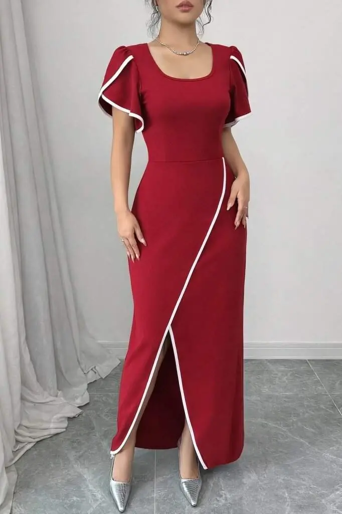 Kadın Kısa Kollu Kare Yakalı önden çapraz Kesim Detaylı Krep Elbise