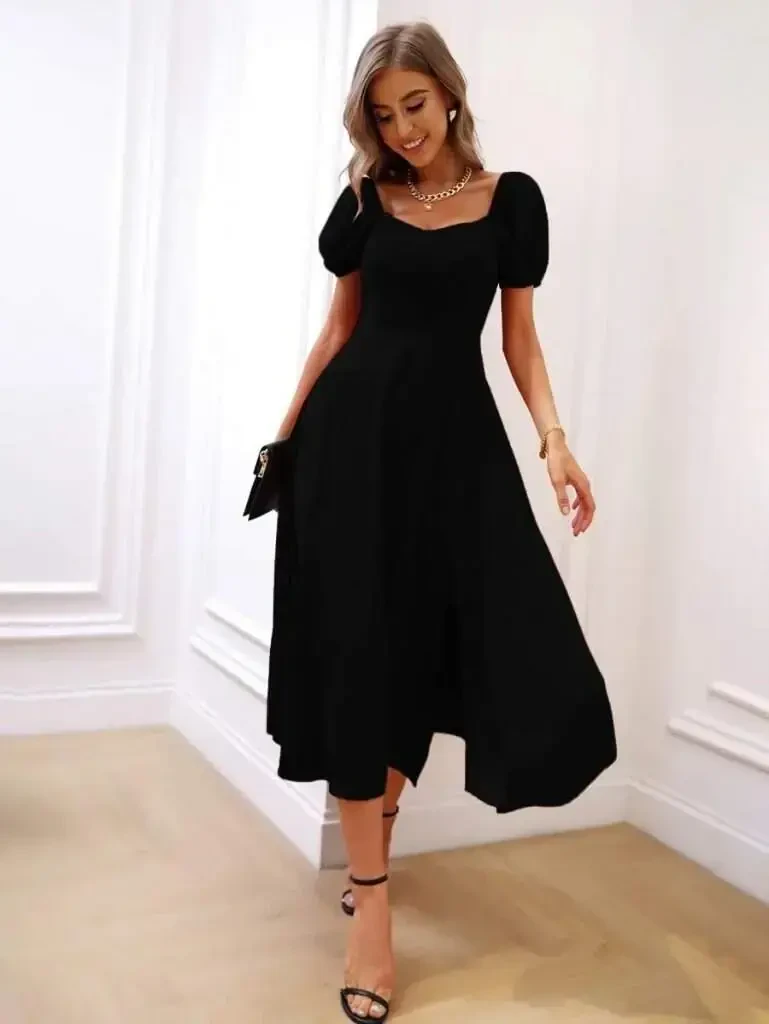 Modelin ölçüleri ve üzerindeki beden bilgisi, ürünün üzerinizdeki duruşu hakkında fikir vermesi amacıyla belirtilmiştir. Elbisenin kalıbı ve diğer detayları, farklı vücut tiplerine uyum sağlayacak şekilde tasarlanmıştır. Yırtmaç detayı, elbiseye hareket ve şıklık katarken, midi boyu hem günlük kullanım hem de özel günler için idealdir. Janjan krep kumaş, hafif ve rahat bir kullanım sunar. Kare yaka, yüz hatlarınızı ön plana çıkarır ve zarif bir görünüm sağlar. Kısa kollu tasarım, yaz aylarında serin ve konforlu olmanızı sağlar.