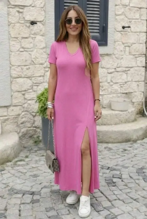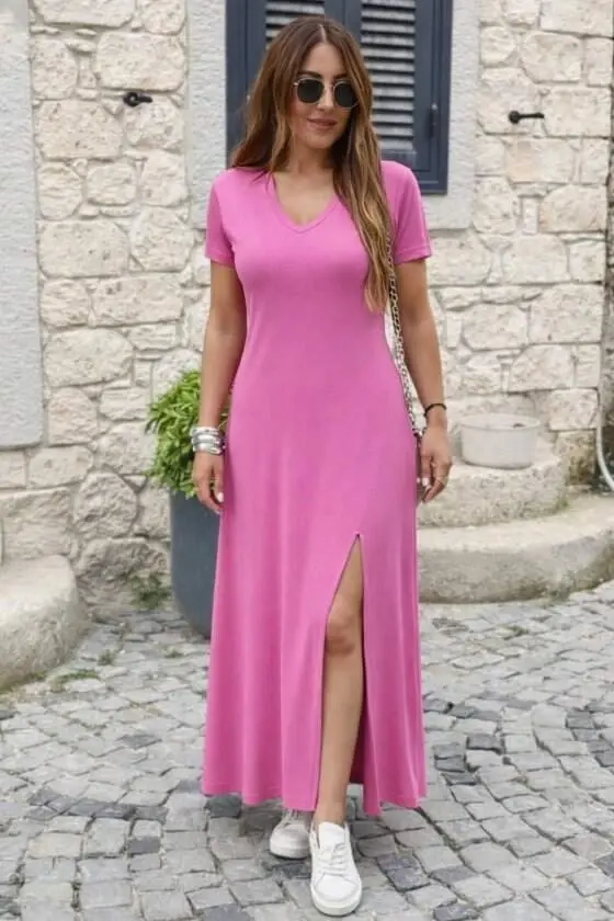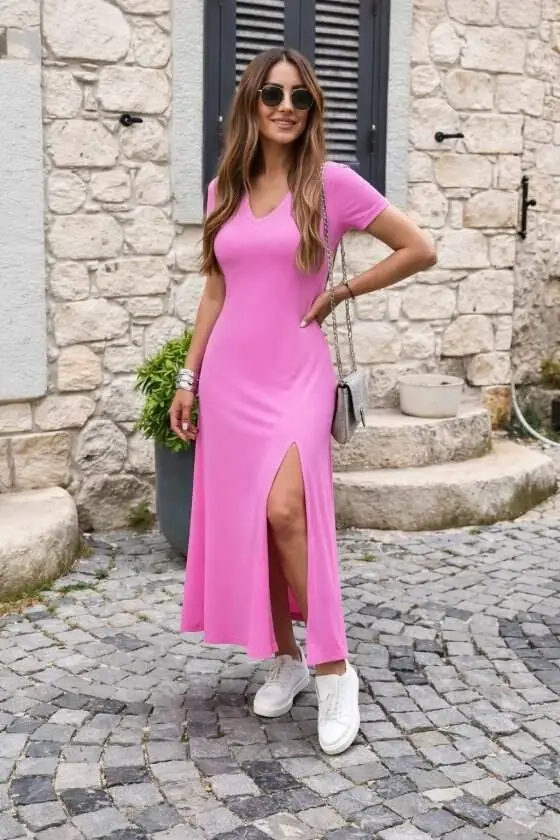 Kadın Kısa Kollu V Yakalı Maksi Boy Viskon Elbise