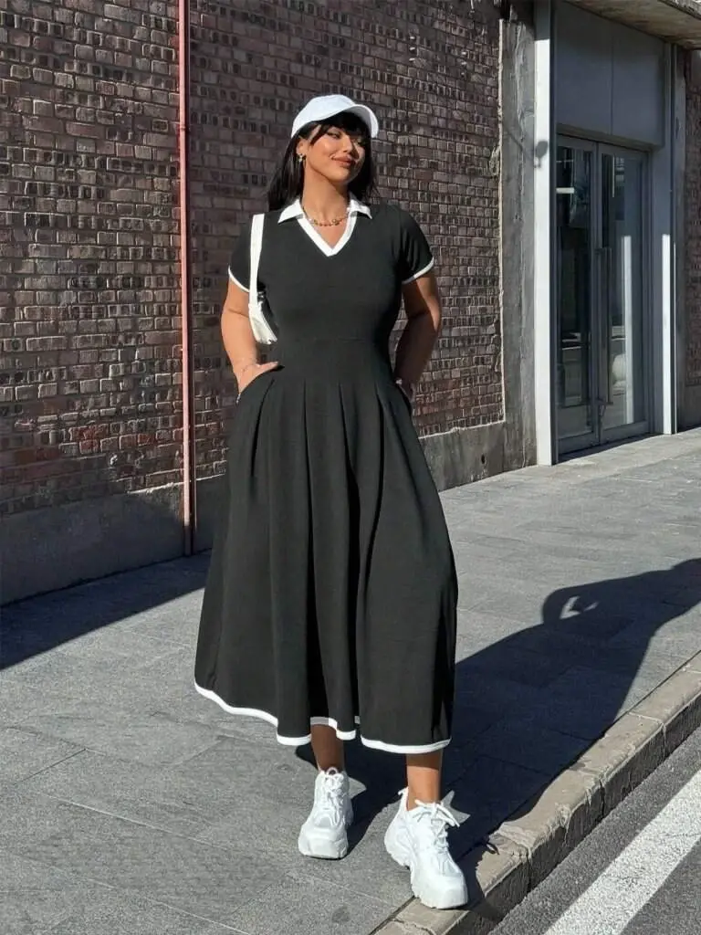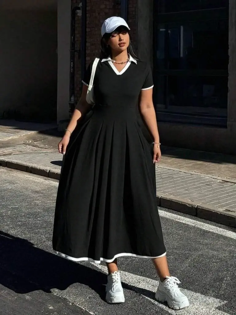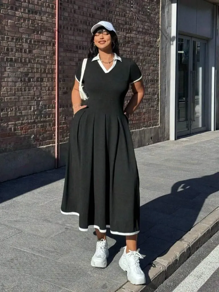 Kadın Kısa Kollu V Yakalı Pileli Uzun Janjan Krep Elbise