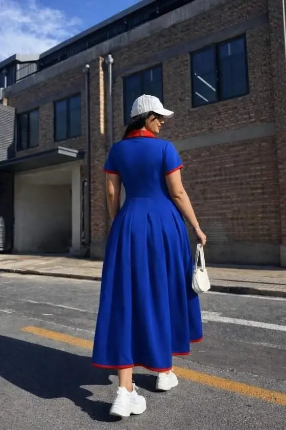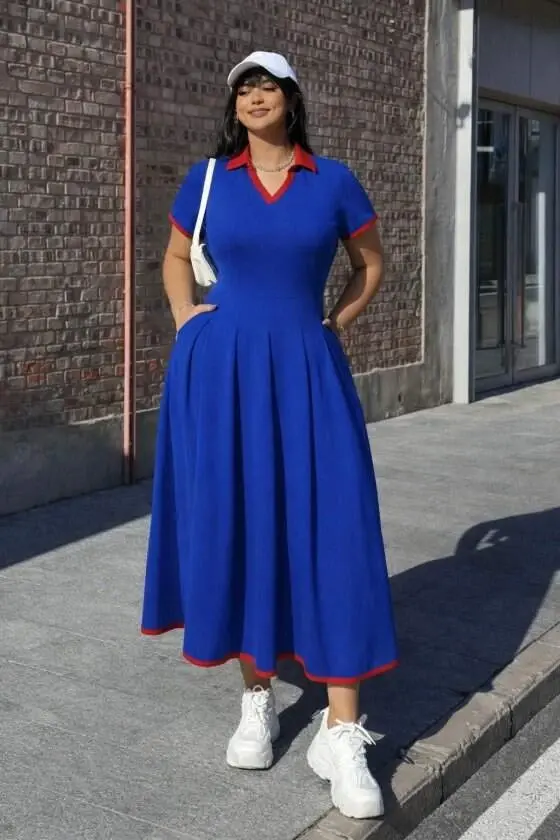 Kadın Kısa Kollu V Yakalı Pileli Uzun Janjan Krep Elbise