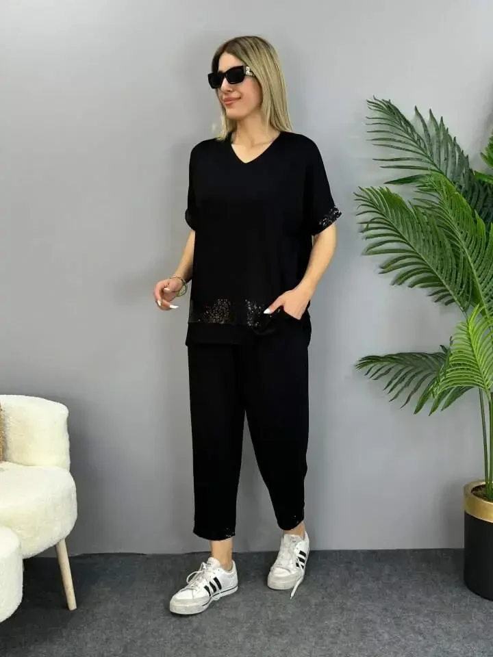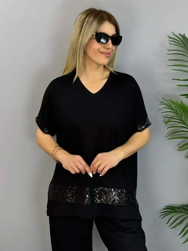 Kadın Kısa Kollu V Yakalı Pul Payetli Viskon İki İplik Bluz ve Pantolon İkili Takım ile şıklığı ve rahatlığı bir arada yaşayın. Bu özel tasarım takım, günlük kullanımınızdan özel davetlerinize kadar her ortamda stilinizi konuşturmanızı sağlayacak. Bluzun V yakası ve zarif pul payet detayları, feminen bir dokunuş katarken, viskon iki iplik kumaşın yumuşak dokusu gün boyu konfor sunar. Pantolonun rahat kesimi, hareket özgürlüğünüzü kısıtlamadan şık bir görünüm elde etmenize yardımcı olur. İster tek başına, ister kombinleyerek kullanabileceğiniz bu takım, gardırobunuzun vazgeçilmez parçası olmaya aday. Modelin üzerindeki M/38 beden, ideal proporsiyonları vurgularken, farklı beden seçenekleri ile her vücut tipine uyum sağlar. Takımın modern ve göz alıcı tasarımı, sizi her ortamda öne çıkaracak. Hem bluz hem de pantolon, ayrı ayrı kombinlenebilir, böylece farklı stiller yaratma imkanı sunar. Bu takım, şıklığına önem veren ve rahatlıktan ödün vermek istemeyen kadınlar için mükemmel bir seçimdir. Gardırobunuzu zenginleştirecek, size özgüven katacak ve her zaman şık hissetmenizi sağlayacak bir yatırımdır. Üstelik, viskon kumaşın nefes alabilen yapısı sayesinde, sıcak havalarda bile terlemeden rahatlıkla kullanabilirsiniz. Pul payet detayları, ışığı yakalayarak hareketli bir görünüm sunar ve dikkatleri üzerinize çeker. Bu takım, sadece bir kıyafet değil, aynı zamanda bir stil ifadesidir. Kendinizi özel hissetmek ve her zaman şık görünmek için bu takımı tercih edin.