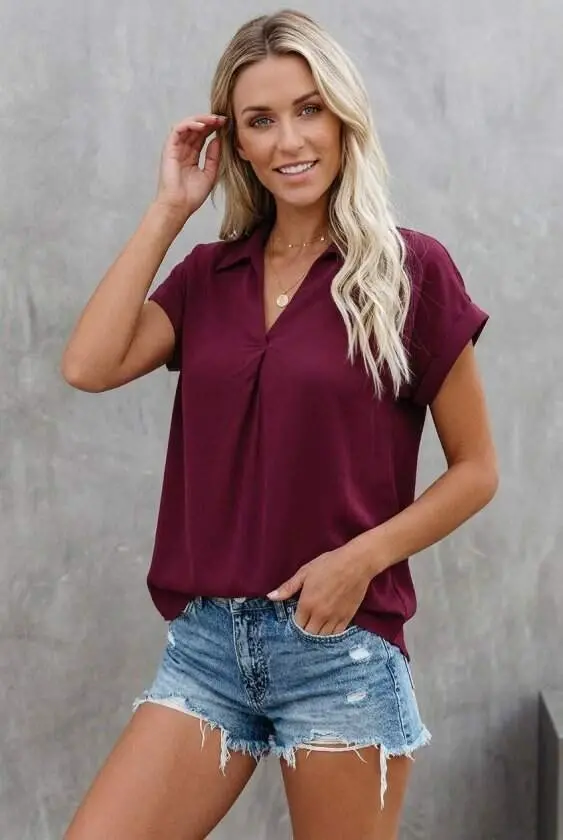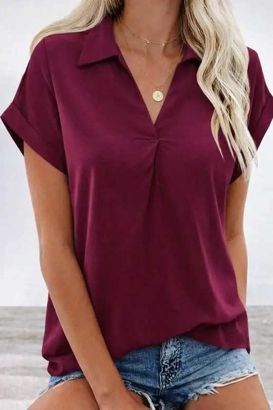 Kadın Kısa Kollu Yakalı Dokuma Viskon BluzModelin Ölçüleri: Boy: 165, Kg: 55, Göğüs: 90, Bel: 72, Kalça: 100Modelin üzerindeki ürün M/38 bedendirDESEN-DiğerleriKALIP-Klasik
