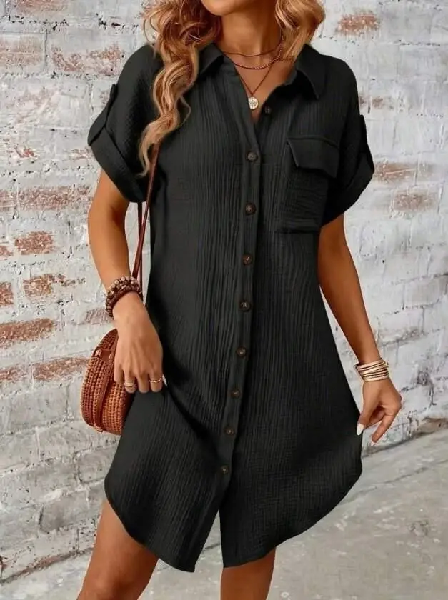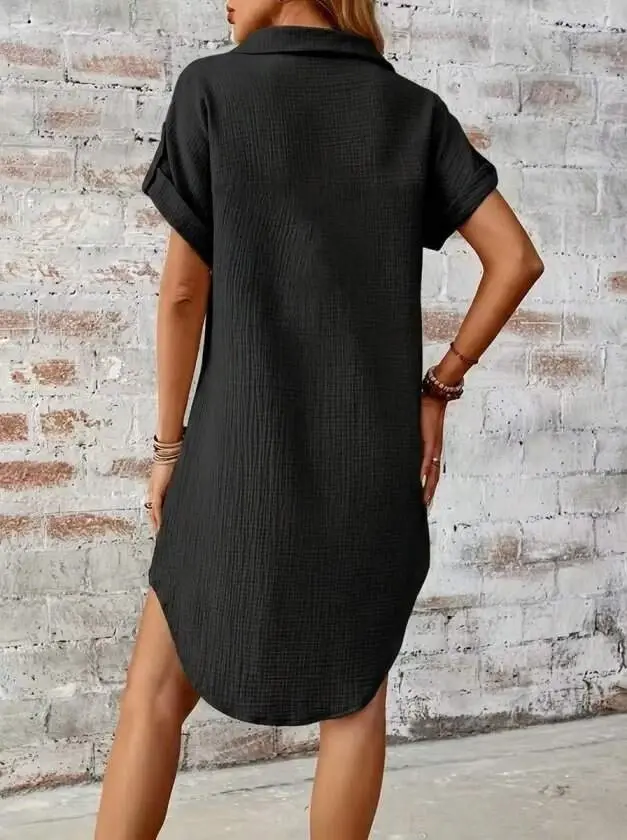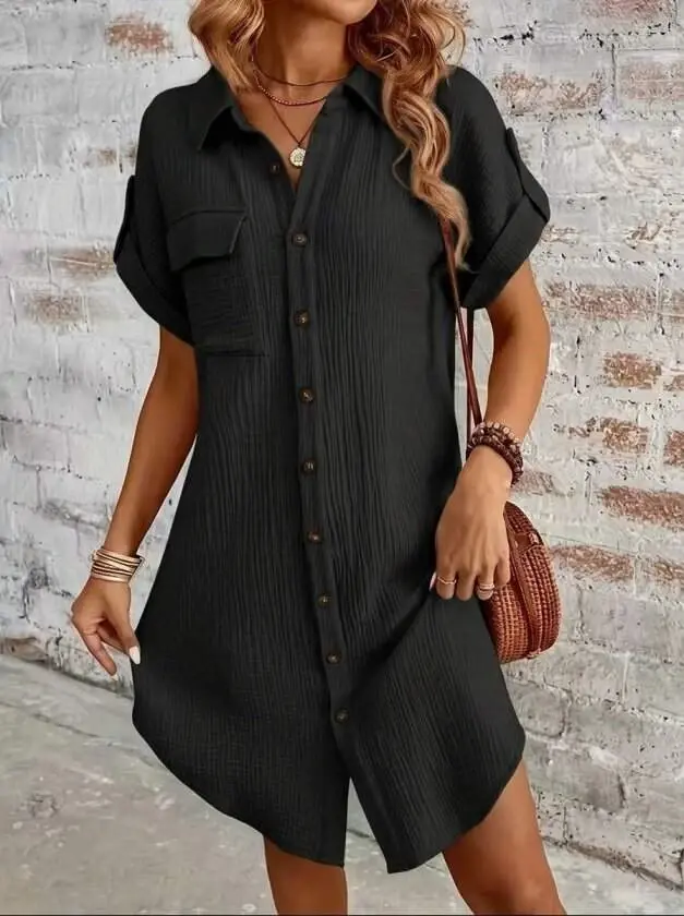 Kadın Kısa Kollu Yakalı önden Düğmeli Bürümcük Kısa Elbise