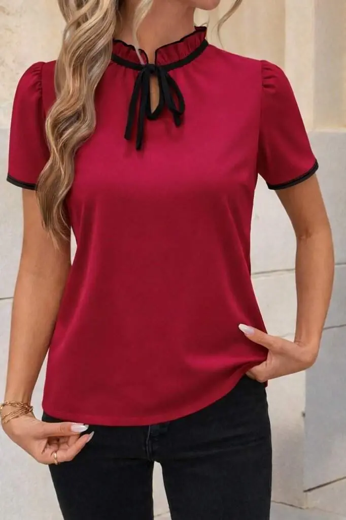 Kadın Kısa Kollu Yakası Fırfırlı Bağcıklı Janjan Krep BluzModelin Ölçüleri: Boy: 165, Kg: 55, Göğüs: 90, Bel: 72, Kalça: 100Modelin üzerindeki ürün M/38 bedendirDESEN-DiğerleriKALIP-Klasik