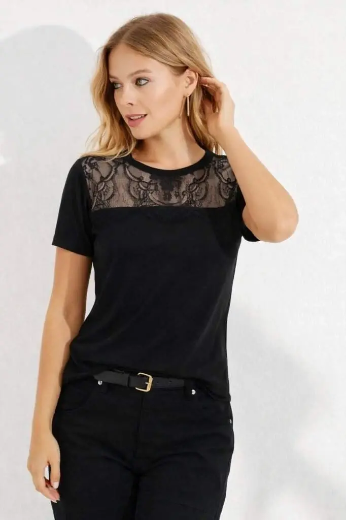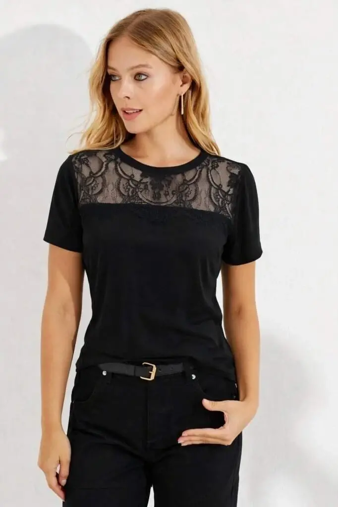 Kadın Kısa Kollu Yuvarlak Yaka ön Dantel Detaylı Viskon Bluz
