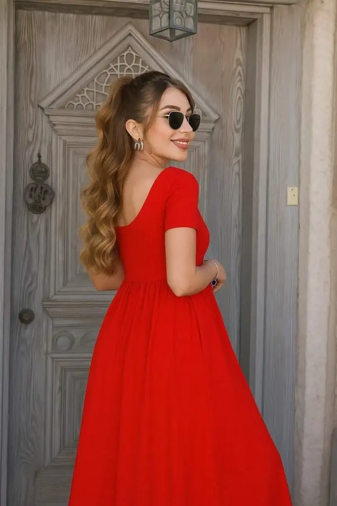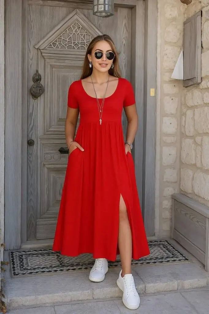 Kadın Kısa Kollu Yuvarlak Yaka önden Yırtmaçlı Cepli Viskon Uzun Elbise