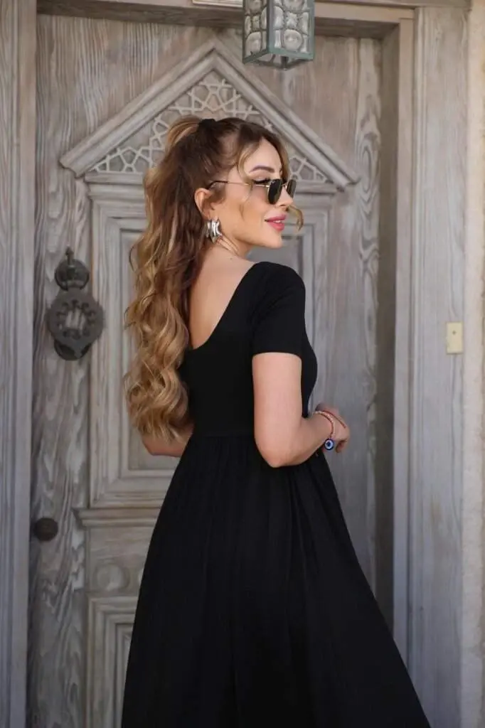 Kadın Kısa Kollu Yuvarlak Yaka önden Yırtmaçlı Cepli Viskon Uzun Elbise