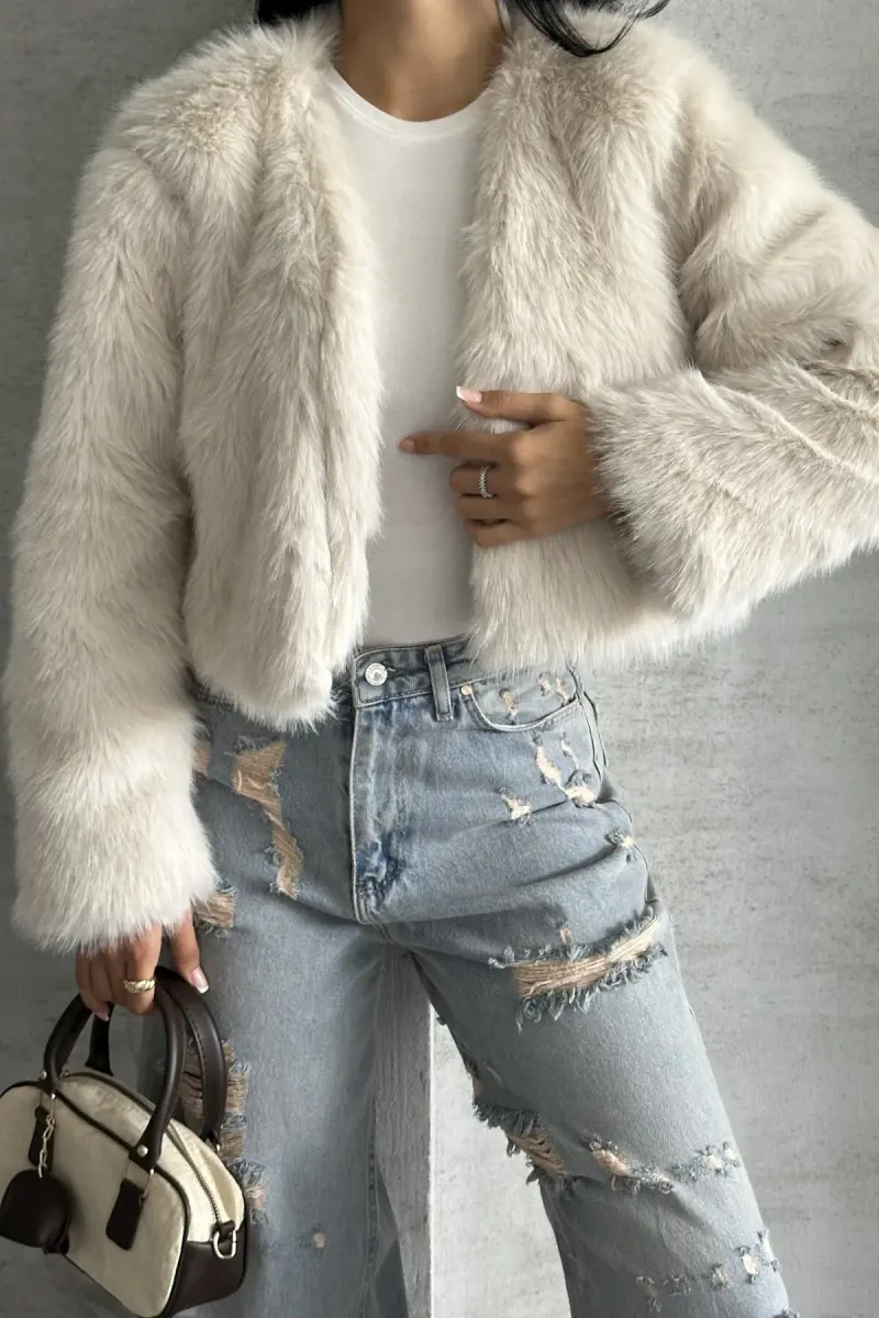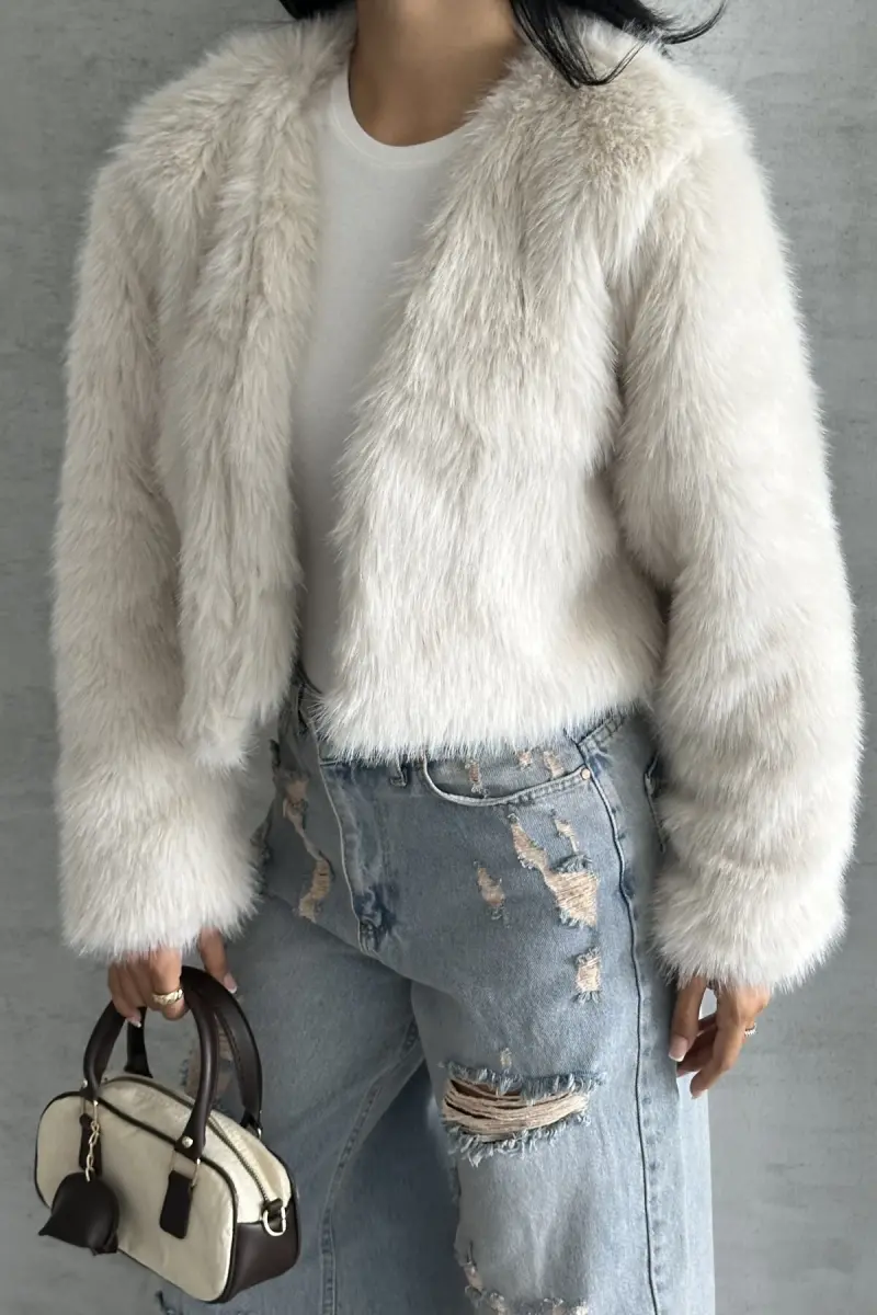 Kadın Kısa Yumuşak Premium Kürk Ceket-Bejprv