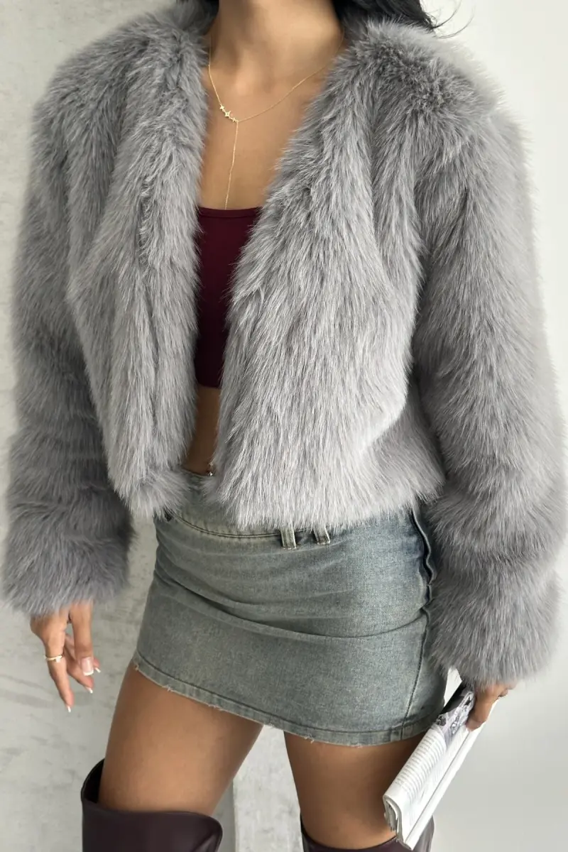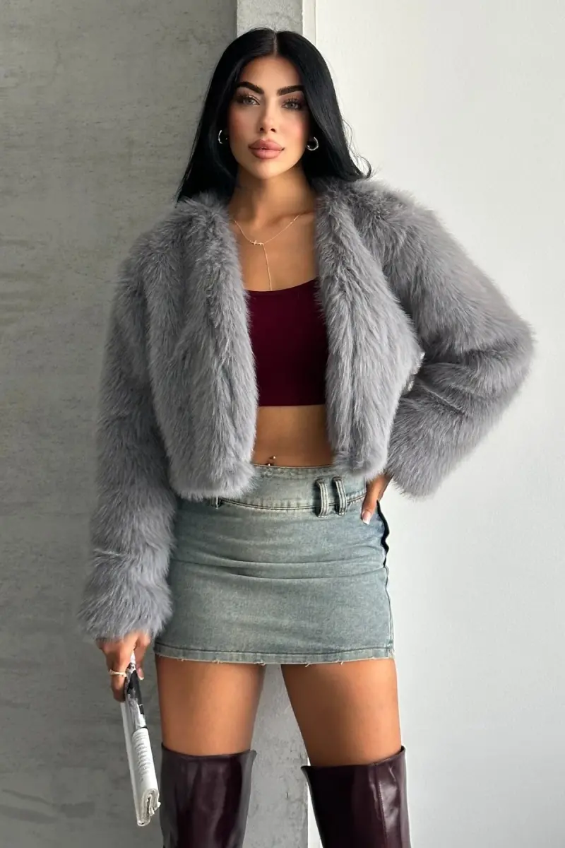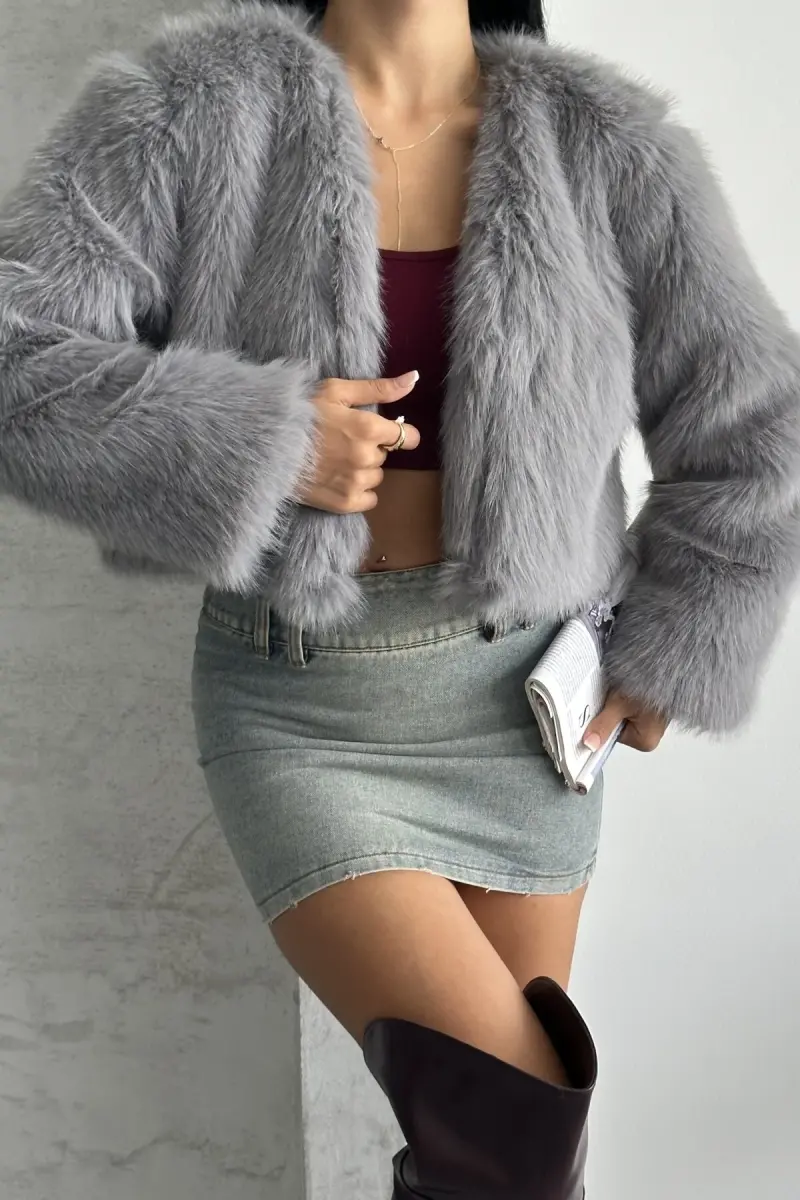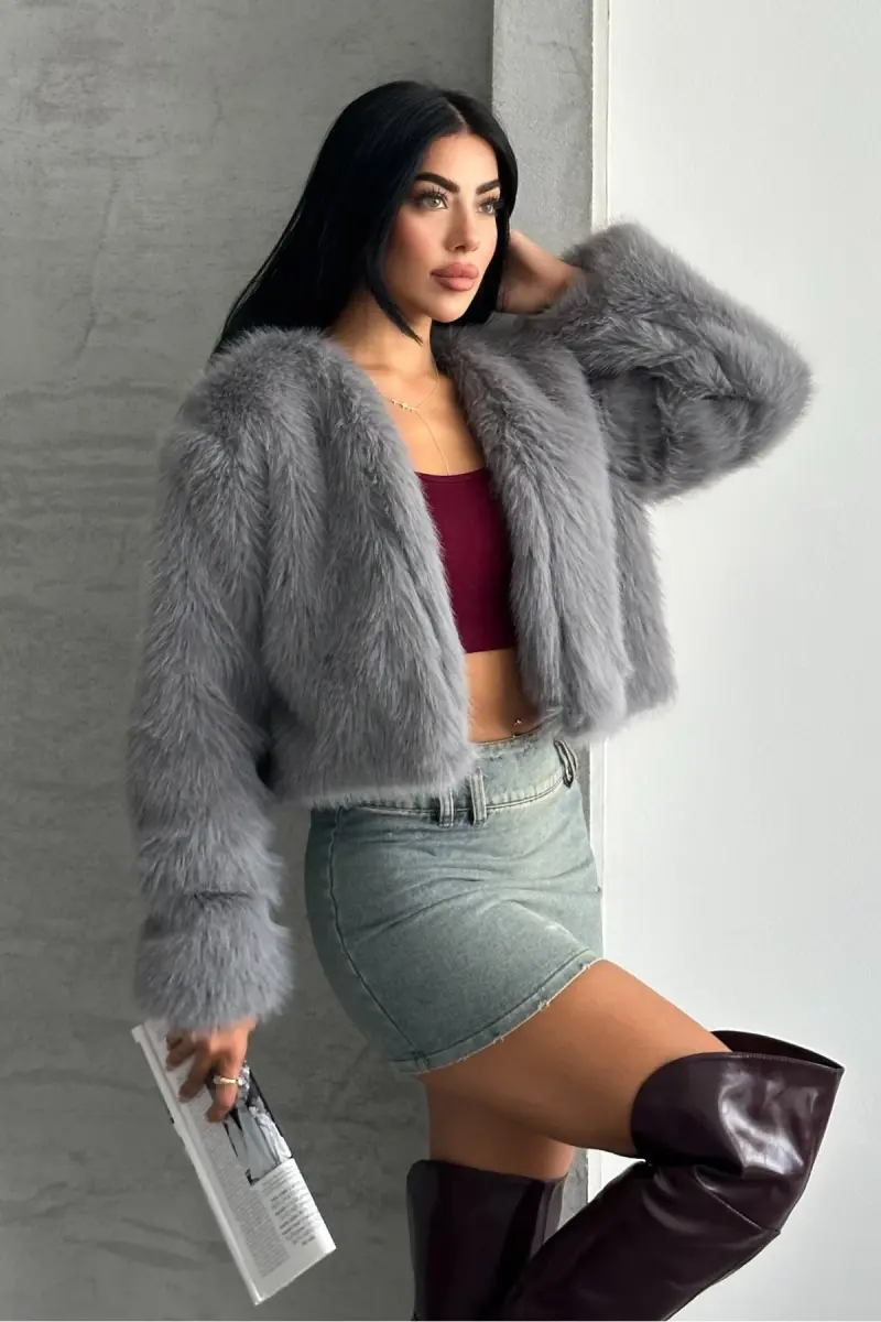 Kadın Kısa Yumuşak Premium Kürk Ceket-Griprv