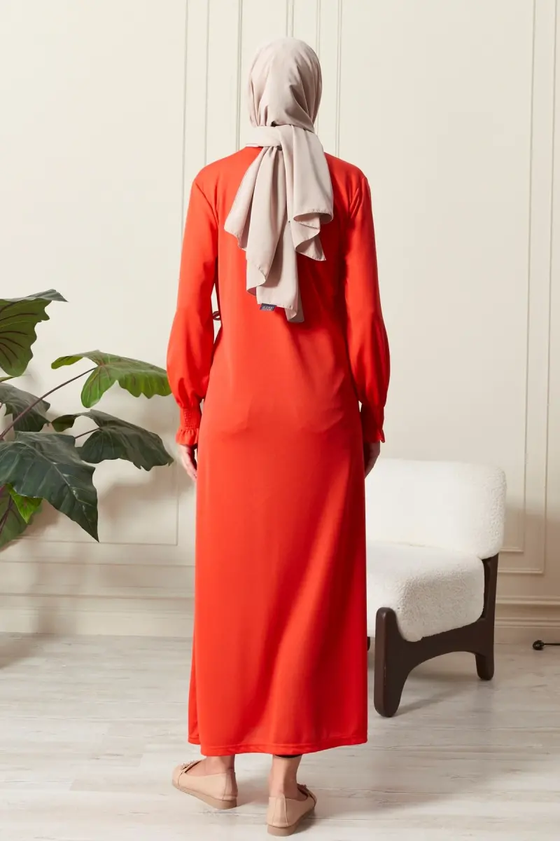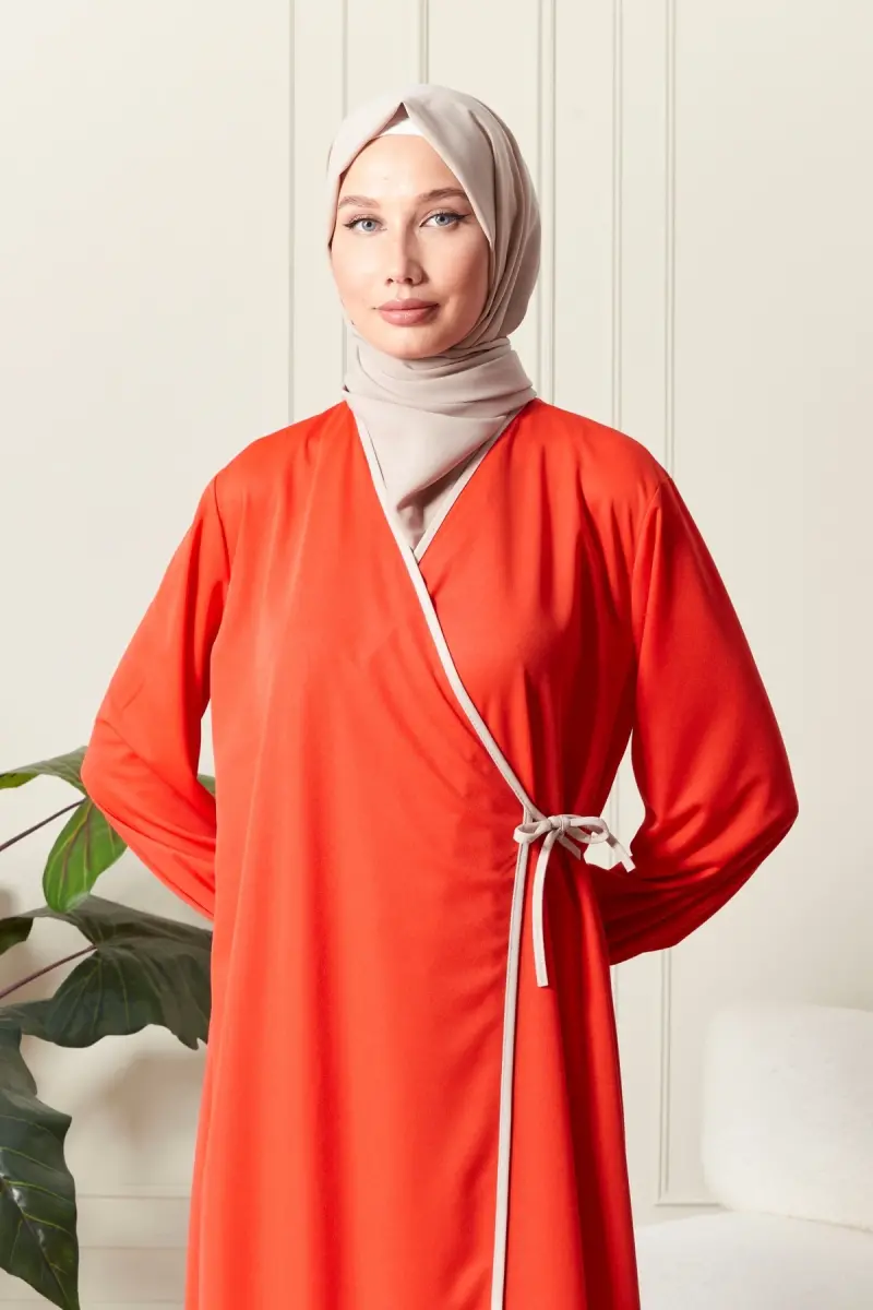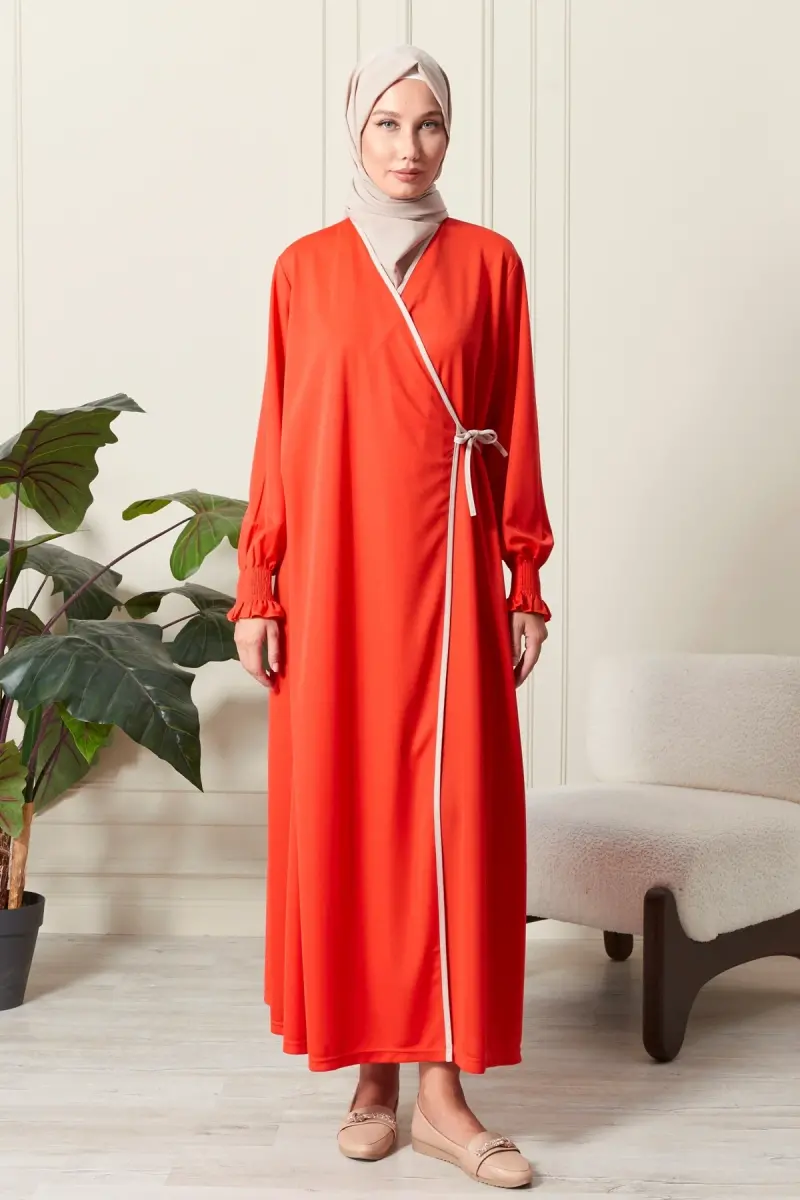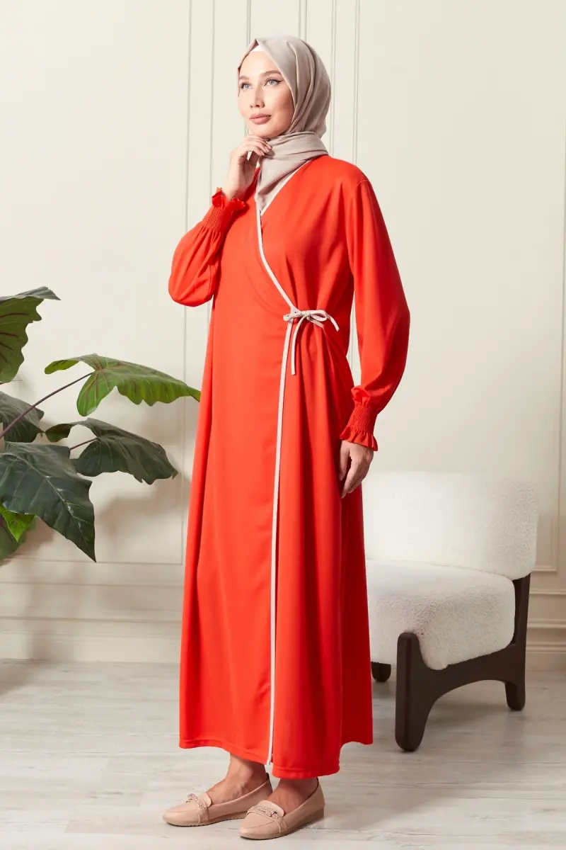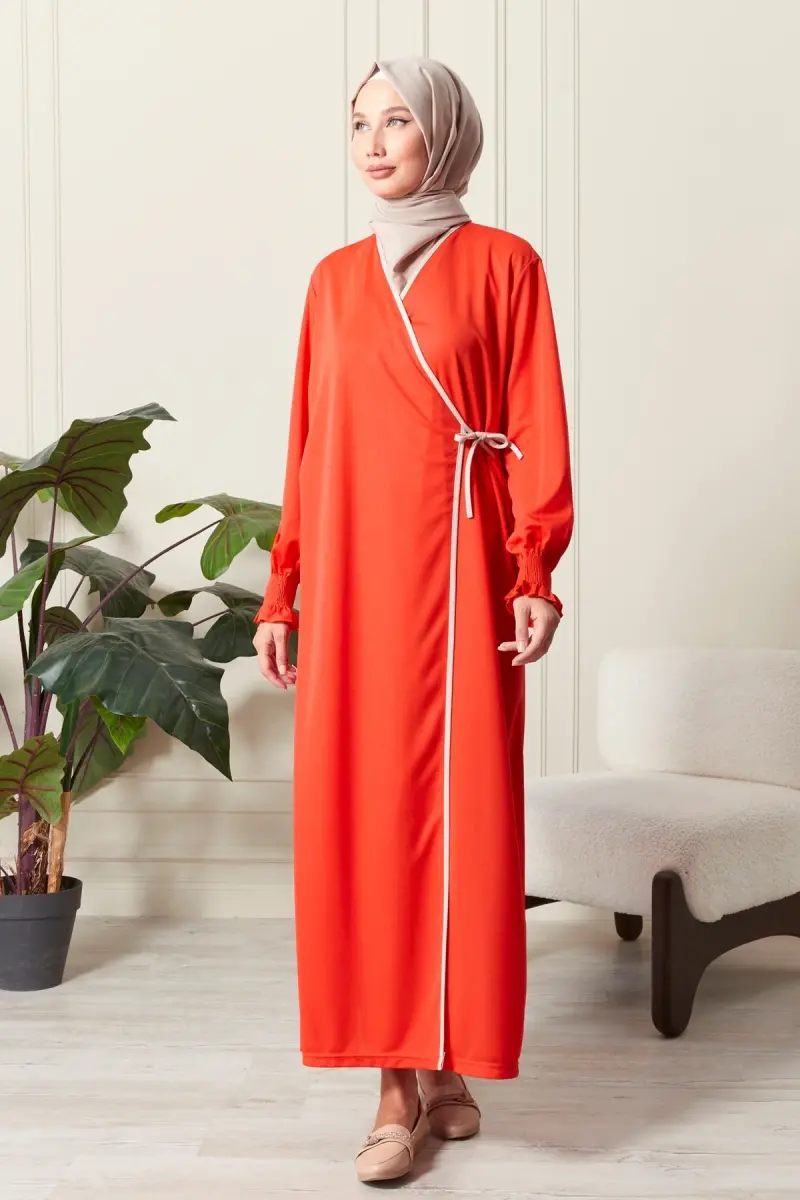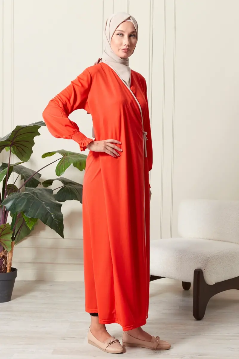 Kadın Kol Detaylı Kruvaze Yaka Biyeli Yandan Bağlamalı Namaz Elbisesi-Turuncu