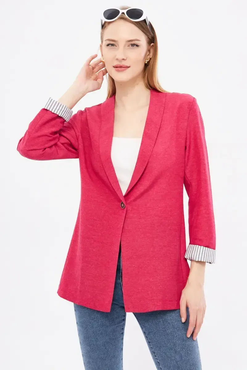 Kadın Koyu Fuşya Kol İçi Çizgili Tek Düğmeli Ceket ARM-22K001122-Koyu Fuşya ile gardırobunuzda yepyeni bir soluk açın! Bu şık blazer ceket, koyu fuşya rengiyle her ortamda dikkatleri üzerinize çekmenizi sağlayacak. ARMONİKA güvencesiyle sunulan bu özel tasarım, modern ve klasik çizgileri bir araya getirerek, hem günlük kullanım hem de özel anlar için ideal bir seçenek sunuyor. Blazer silueti, şıklığınızı ön plana çıkarırken, dokuma kumaşı sayesinde hem dayanıklı hem de konforlu bir deneyim yaşatır.Uzun kollu tasarımı sayesinde mevsim geçişlerinde size eşlik ederken, standart kol yapısı hareket özgürlüğünüzü kısıtlamadan rahat bir kullanım sunar. Basic koleksiyonun bir parçası olan bu ceket, minimalist ve zamansız tasarımıyla her gardırobun vazgeçilmezi olmaya aday. Casual ortamlarda günlük giyim için mükemmel bir seçim olan bu ceket, rahatlığı ve stili bir arada sunar.%50 polyester ve %50 pamuk karışımından üretilmiş olan bu ceket, yumuşak dokusuyla gün boyu konforunuzdan ödün vermenizi engeller. Regular kalıbı sayesinde vücut hatlarınıza uyum sağlayarak rahat bir oturuş sunarken, ceket yaka detayı profesyonel ve şık bir görünüm kazandırır. Pamuk polyester karışımı materyali, kolay bakım avantajı sunarak ceketinizi uzun süre ilk günkü gibi korumanıza yardımcı olur. Type 2 yıkama talimatına uygun olarak temizlenebilir olması, pratiklik sağlayarak size zaman kazandırır.Düz deseni sayesinde farklı kombinler yaratmanıza olanak tanırken, uzun boy tasarımı bacaklarınızı olduğundan daha uzun göstererek şık duruşunuza katkıda bulunur. Kol içindeki çizgili detaylar, cekete dinamik ve modern bir hava katarken, tek düğme detayı şıklığı tamamlar. Bu ceket ile ister ofiste şık bir kombin yapın, ister arkadaşlarınızla keyifli bir gün geçirin, her zaman stil sahibi olacaksınız. Kadın Koyu Fuşya Kol İçi Çizgili Tek Düğmeli Ceket, şıklığı ve konforu bir araya getiren benzersiz bir parçadır. Hemen gardırobunuza ekleyin ve fark yaratın!