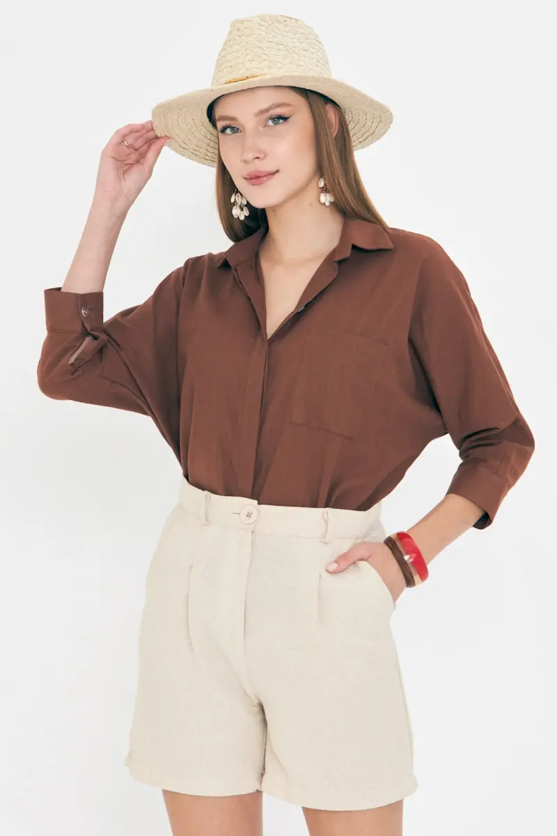 Kadın Koyu Kahve Cepli Salaş Keten Gömlek ARM-21Y001035-Koyu Kahve