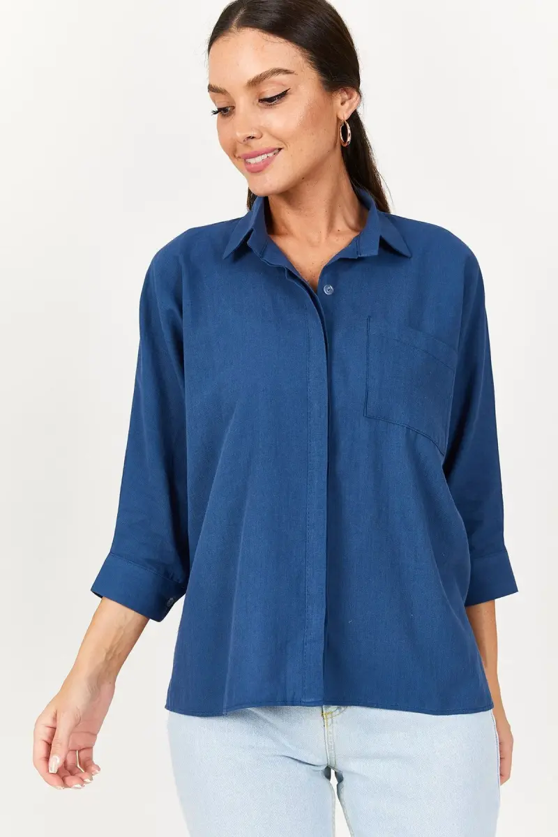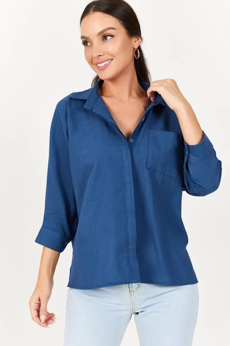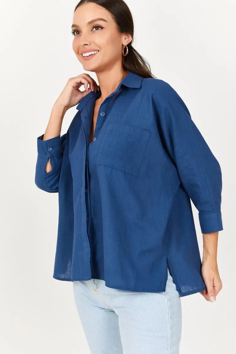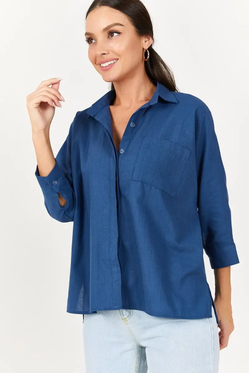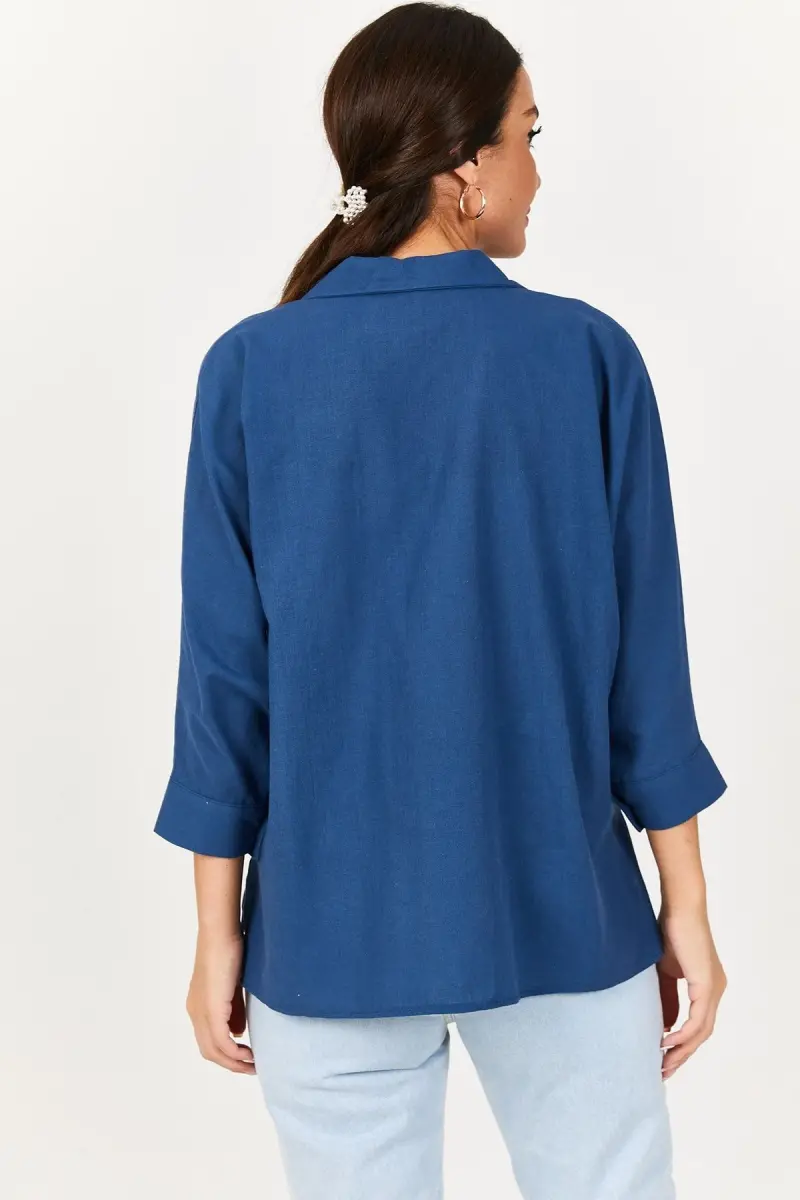 Kadın Koyu Mavi Cepli Salaş Keten Gömlek ARM-21Y001035-Koyu Mavi