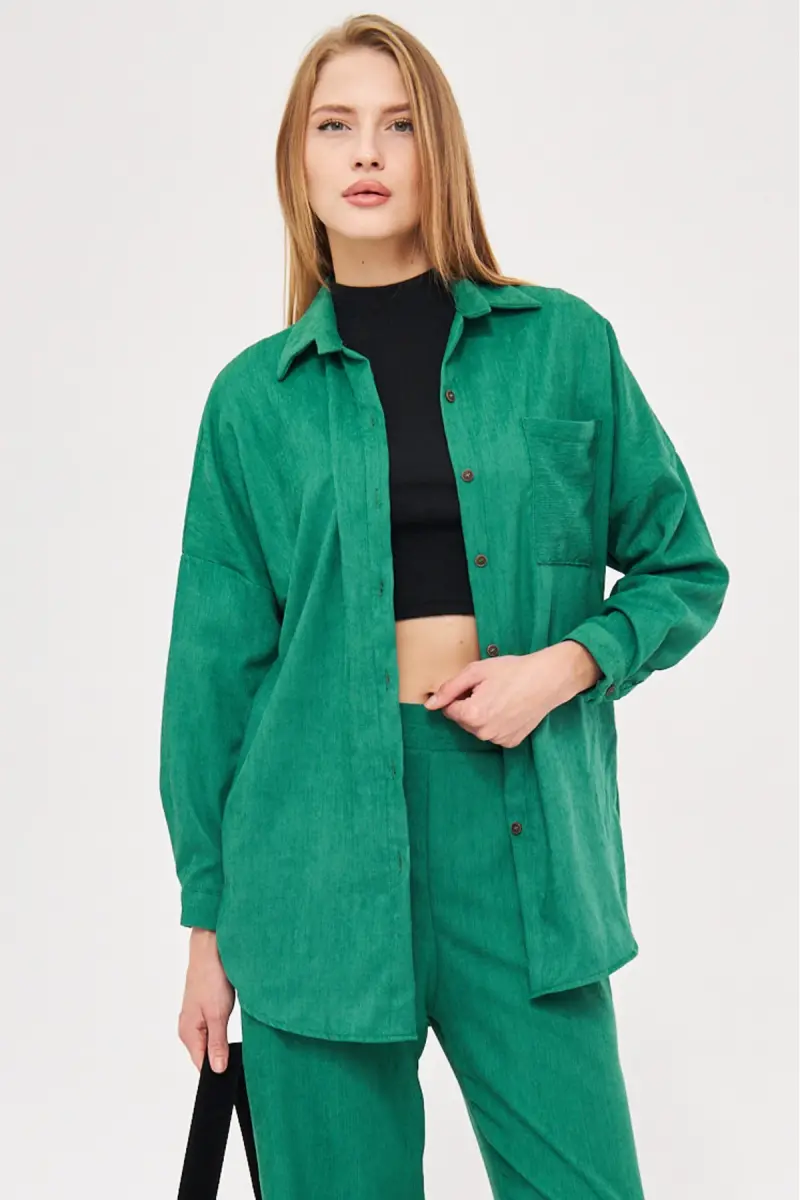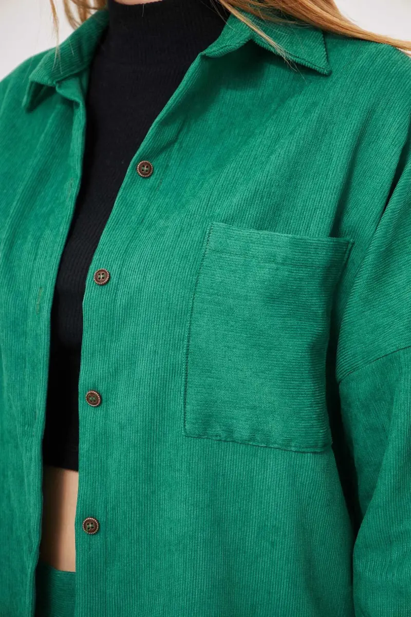Kadın Koyu Yeşil Cepli Oversize İnce Fitilli Kadife Gömlek ARM-24K001076-Koyu Yeşil