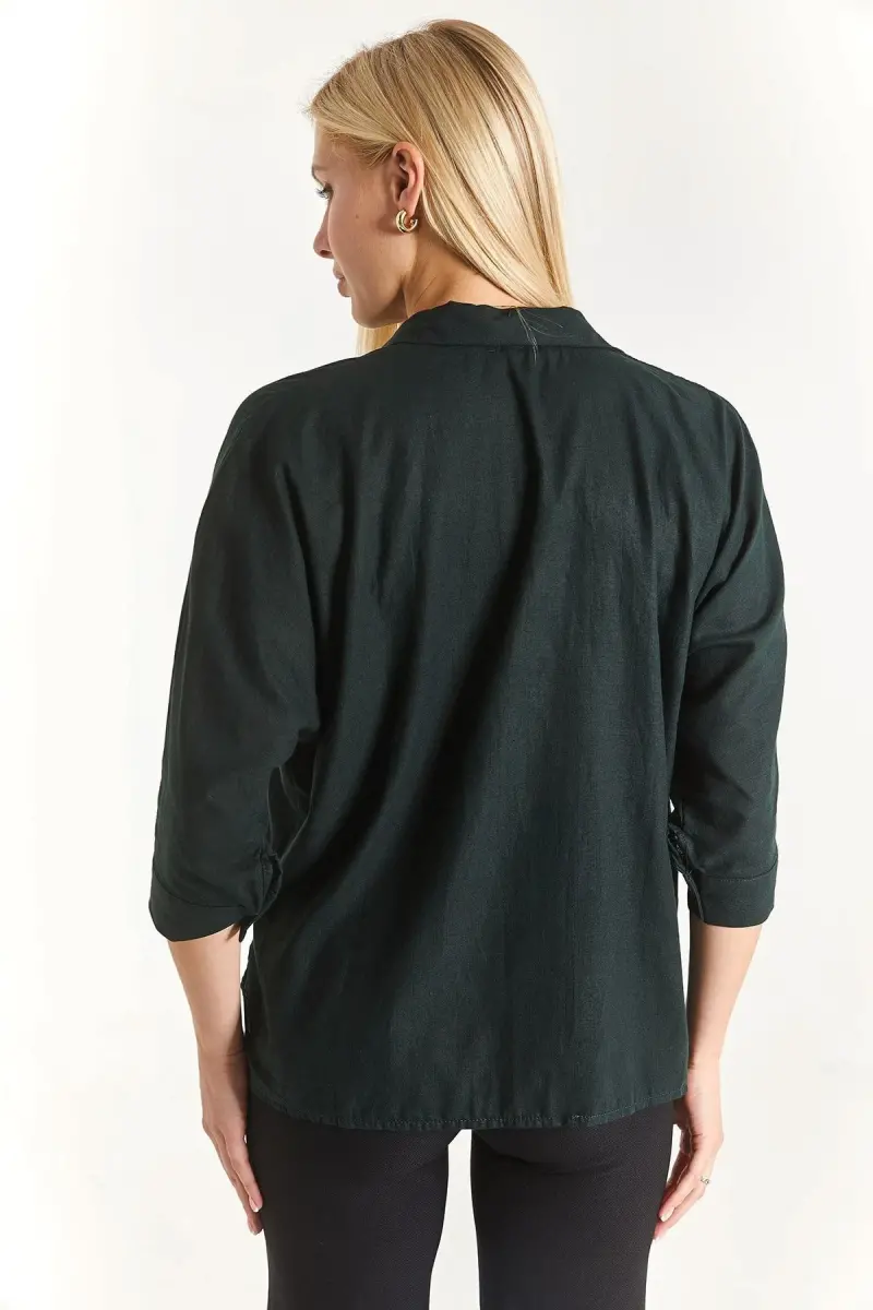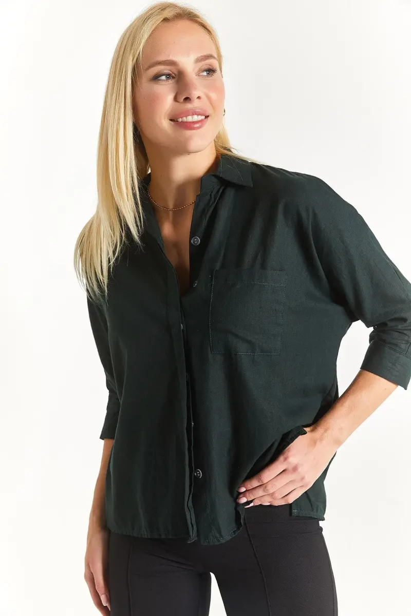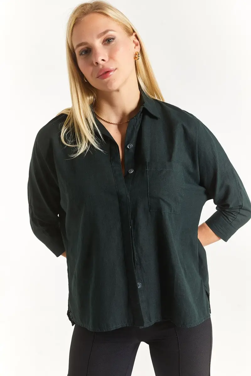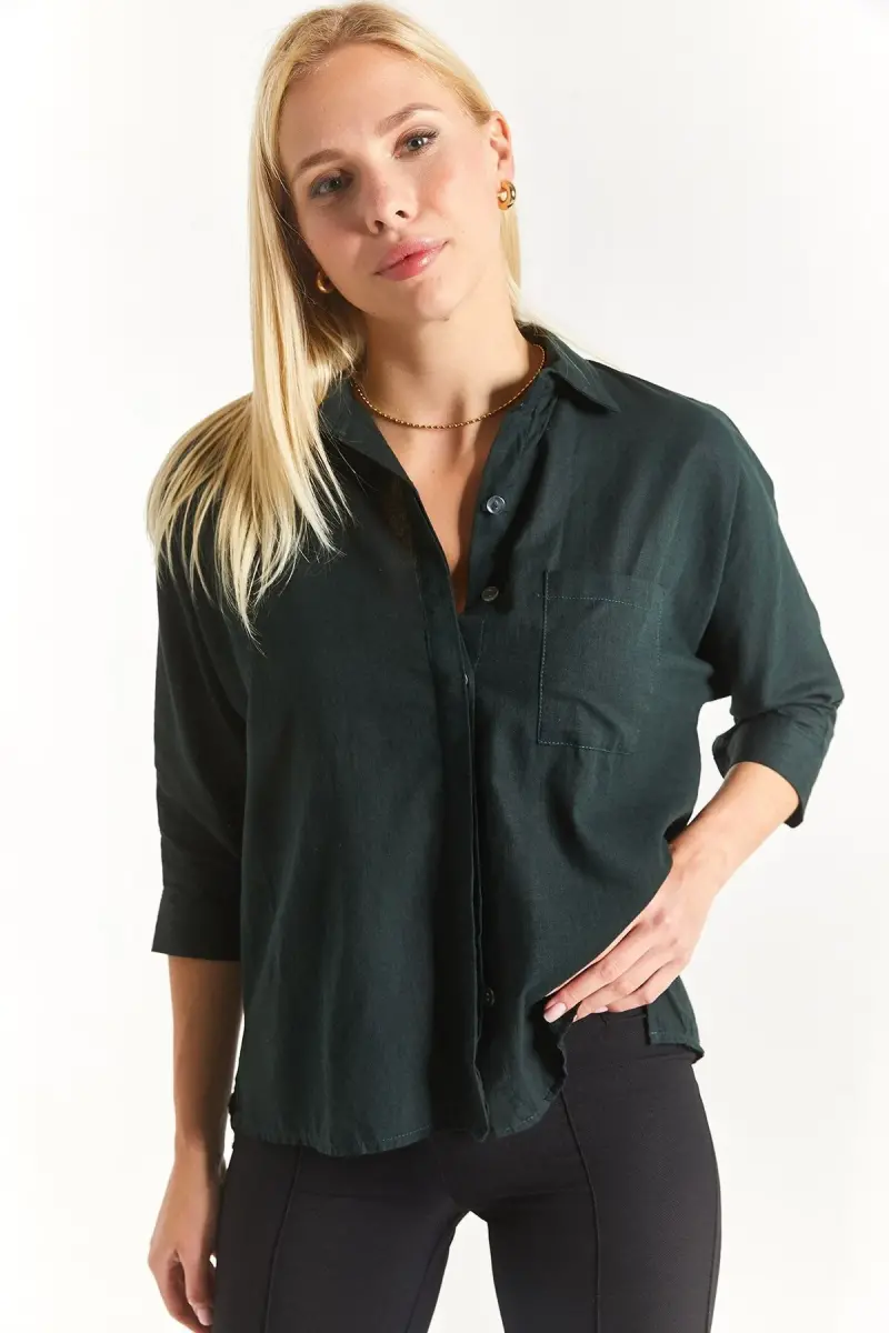 Kadın Koyu Yeşil Cepli Salaş Keten Gömlek Arm-21y001035-Koyu Yeşil