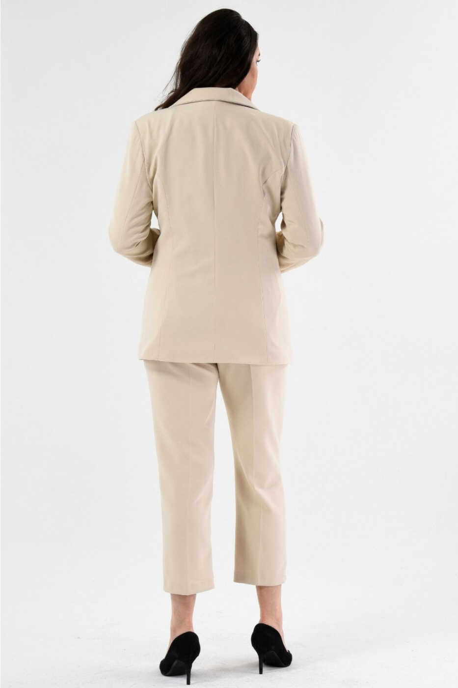 Şıklığı ve konforu bir araya getiren bu takım elbise, her kadının gardırobunda olması gereken bir parça. Krem rengi, her türlü kombinle uyum sağlayarak stilinizi tamamlamanıza yardımcı olur. Blazer ceket, şık düğmeleri ve keskin çizgileriyle dikkat çekerken, kemerli cepli boru paça pantolon ise bacaklarınızı daha uzun ve ince göstererek zarif bir silüet oluşturmanıza yardımcı olur.