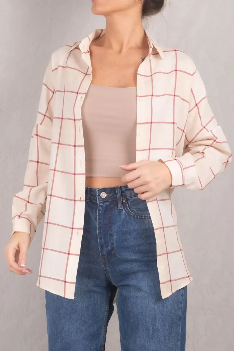 Kadın Krem Kare Desen Oversize Uzun Basic Gömlek ARM-22Y001144-Krem