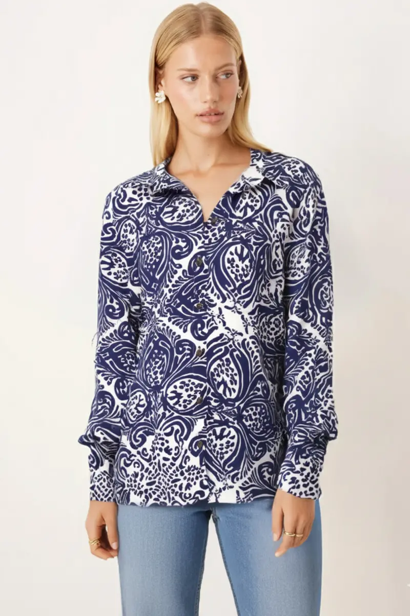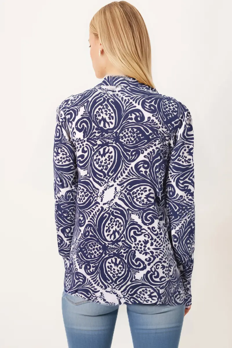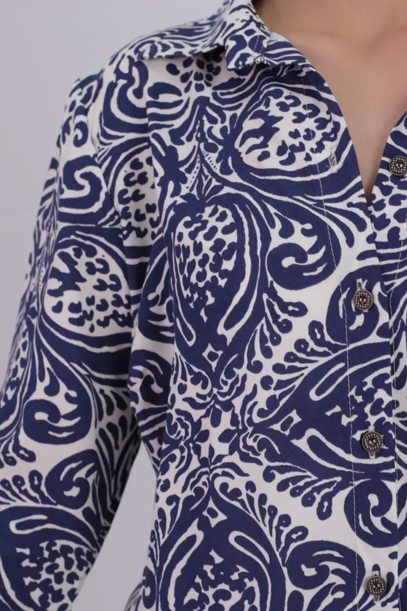 Kadın Lacivert-Beyaz Desenli Uzun Kol Gömlek ARM-22K001123-Lacivert