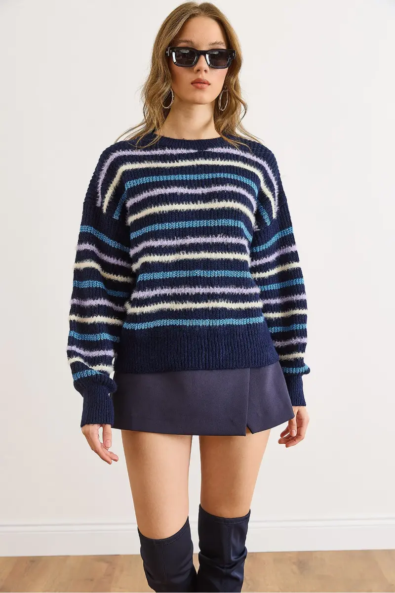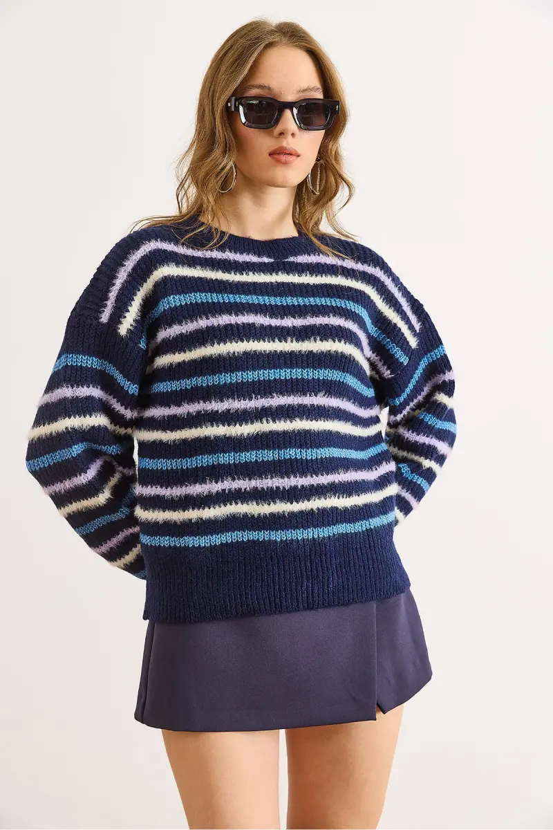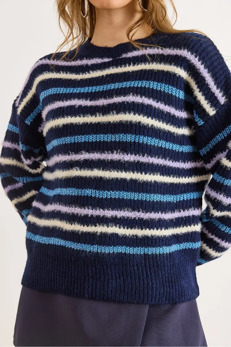 Kadın Lacivert Çizgili Sakal Detaylı Yumuşak Dokulu Triko Kazak KZK-19000893-Lacivert