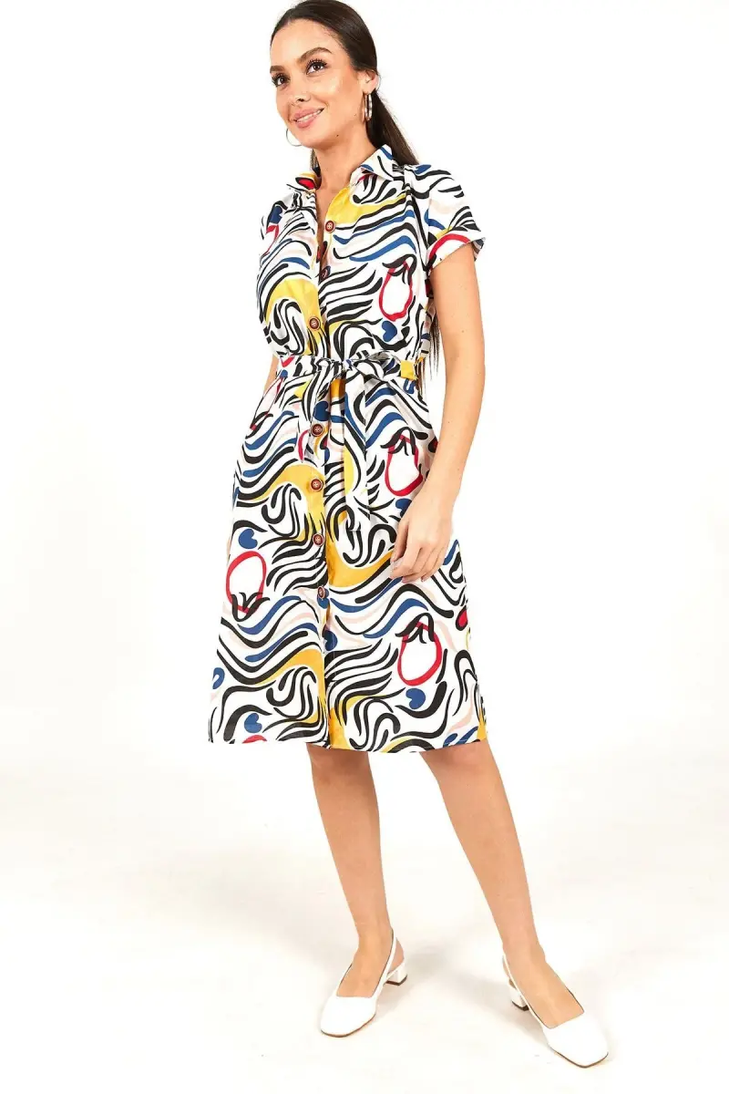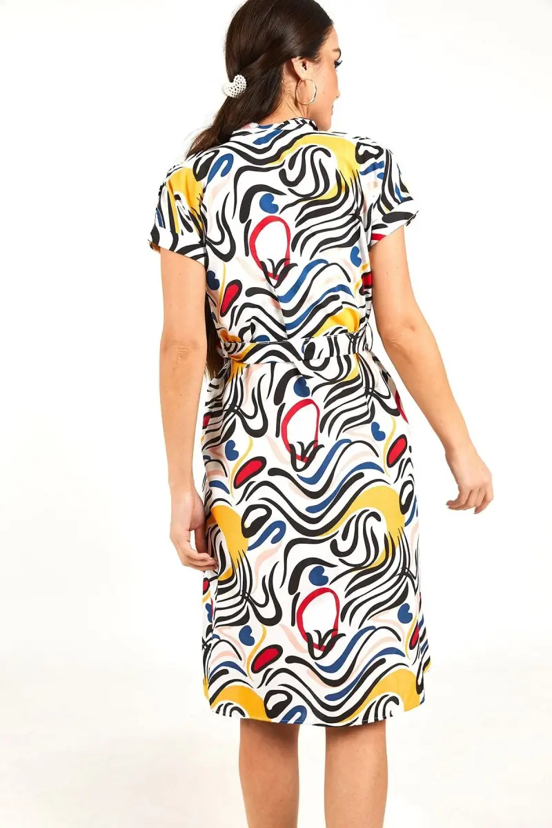 Kadın Lacivert Desenli Kemerli Beli Bağlamalı Kısa Kol Gömlek Elbise ARM-22Y001058-Lacivert