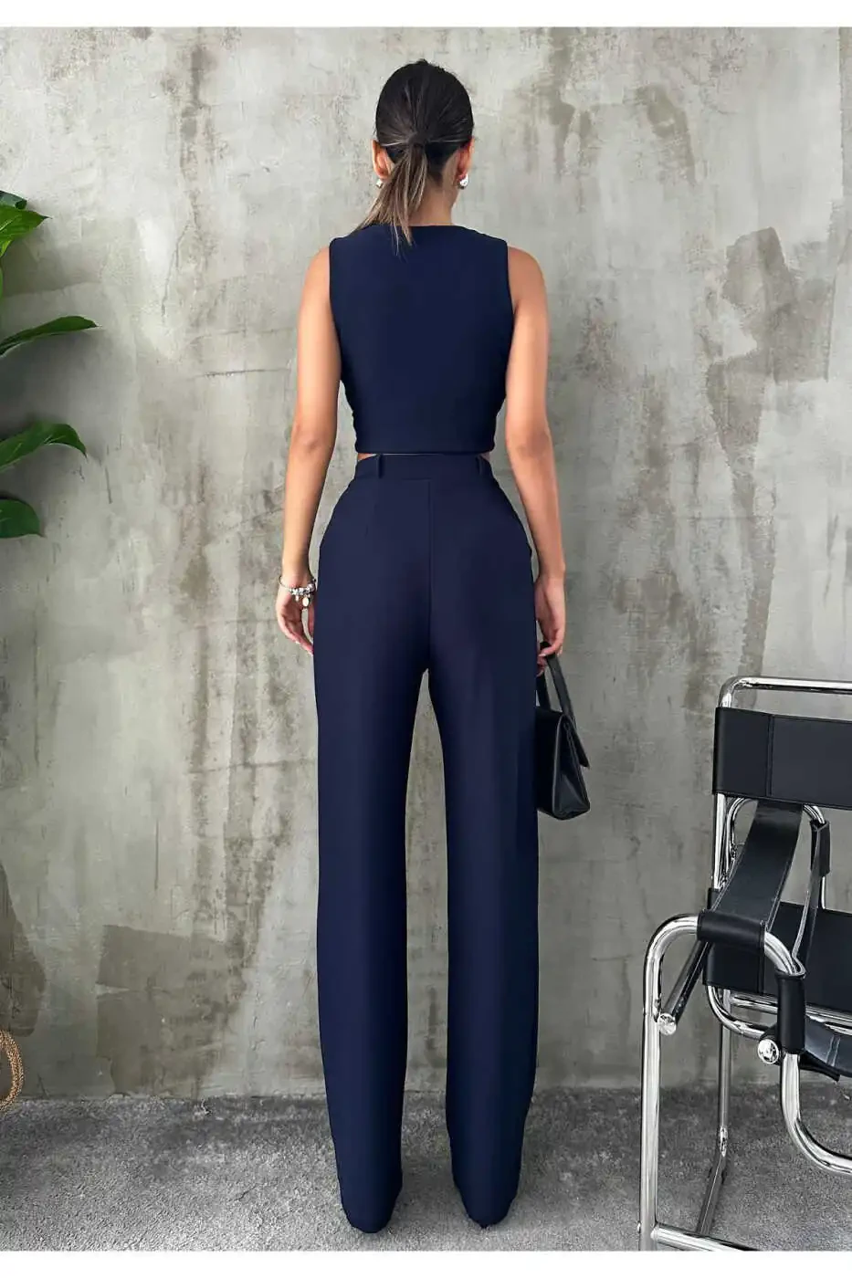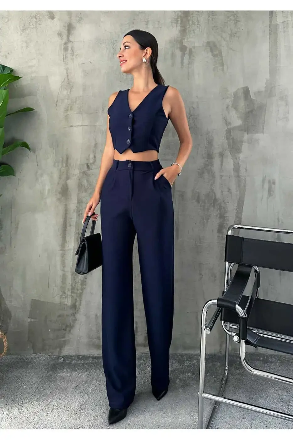 Siz de şıklığın ve rahatlığın tadını çıkarmak için Kadın Lacivert Krep Kumaş Yelek Yüksek Bel Pantolon Takımını hemen sepetinize ekleyin!