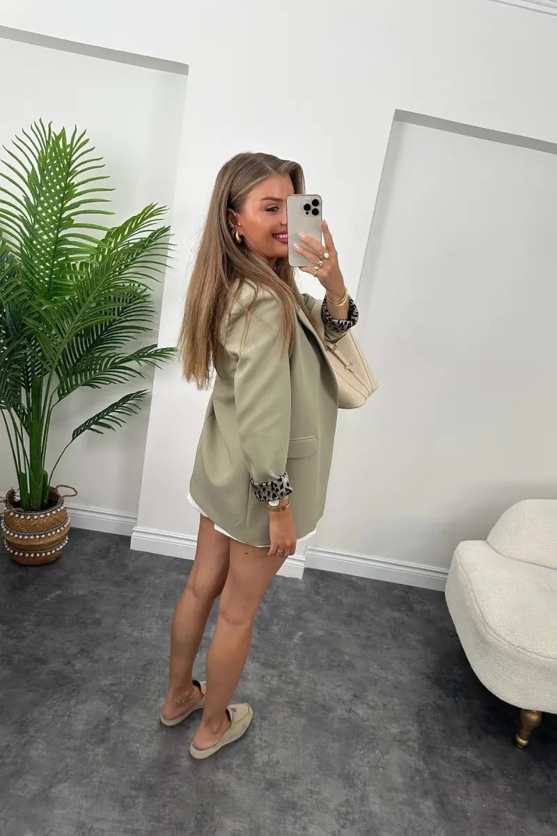 Kadın Leopar Desenli Astarlı Blazer Ceket-Açık Haki