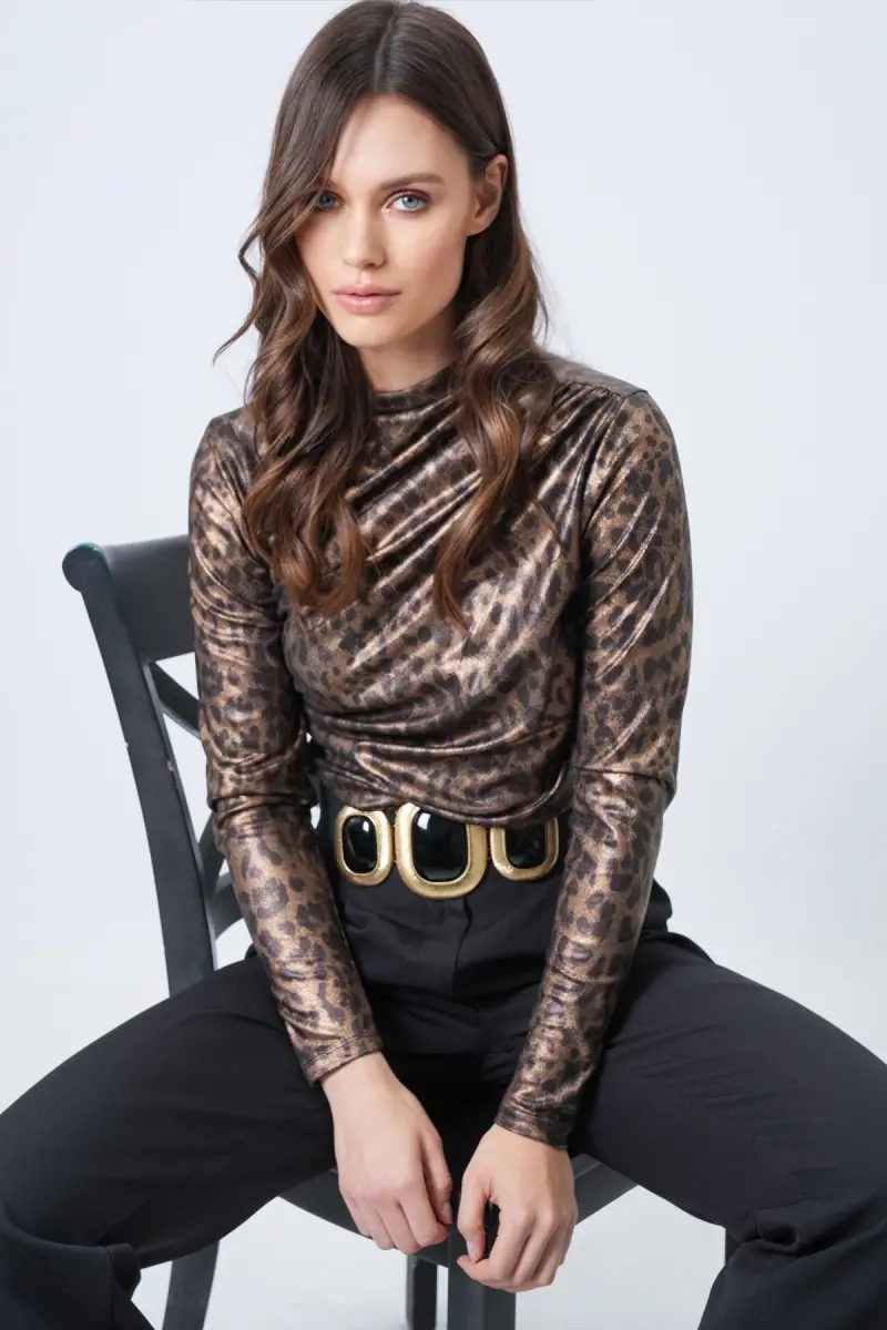 Kadın Leopar Dik Yaka Omzu Drapeli Gümüş Simli Bluz ALC-X11257-LEOPAR