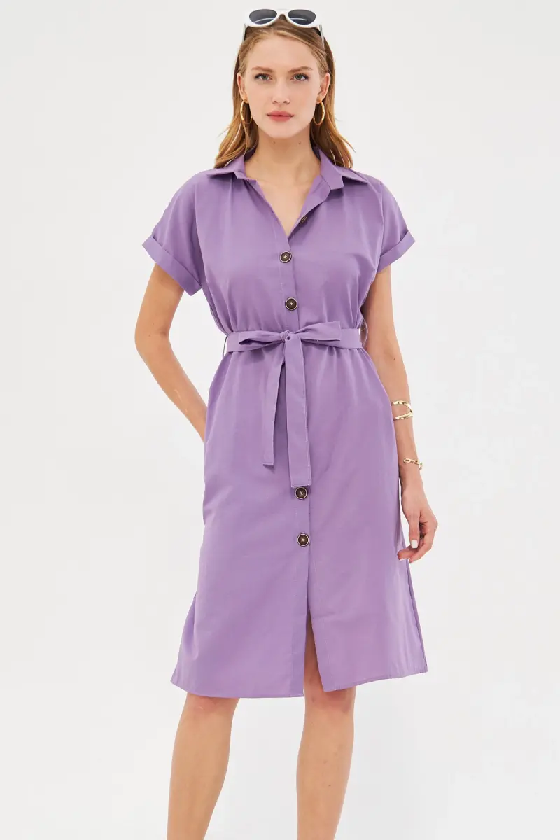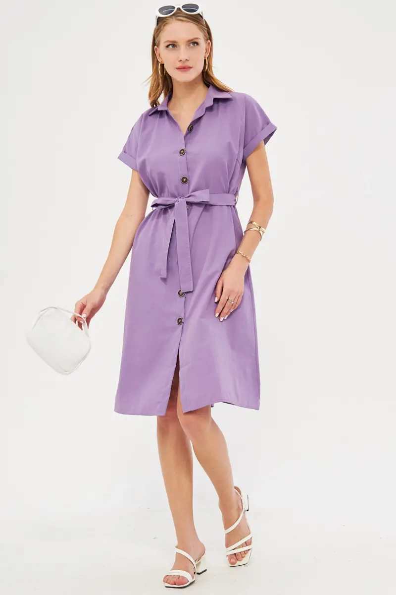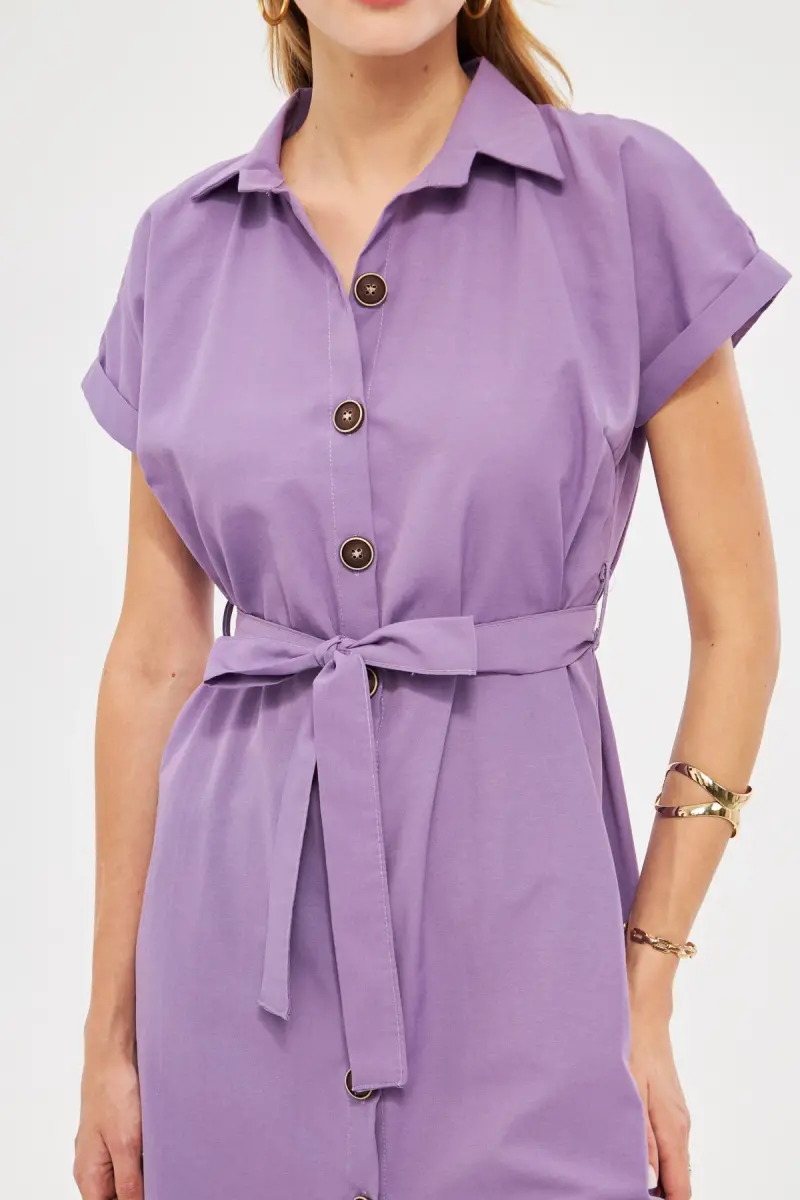 Kadın Lila Beli Kemerli Kısa Kol Gömlek Elbise ARM-19Y001068-Lila