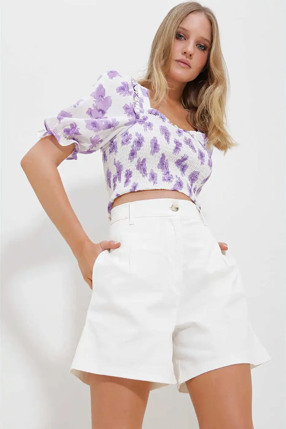 Предлагая захватывающую элегантность с гармоничным сочетанием сиреневого и белого, блузка добавляет женственности благодаря квадратному вырезу и рукавам-арбузам. Укороченный фасон поможет вам создать современный и модный образ.