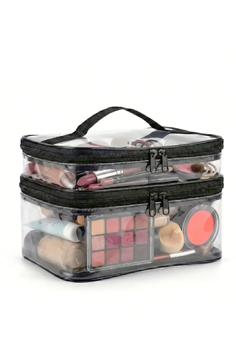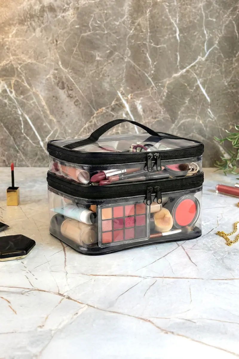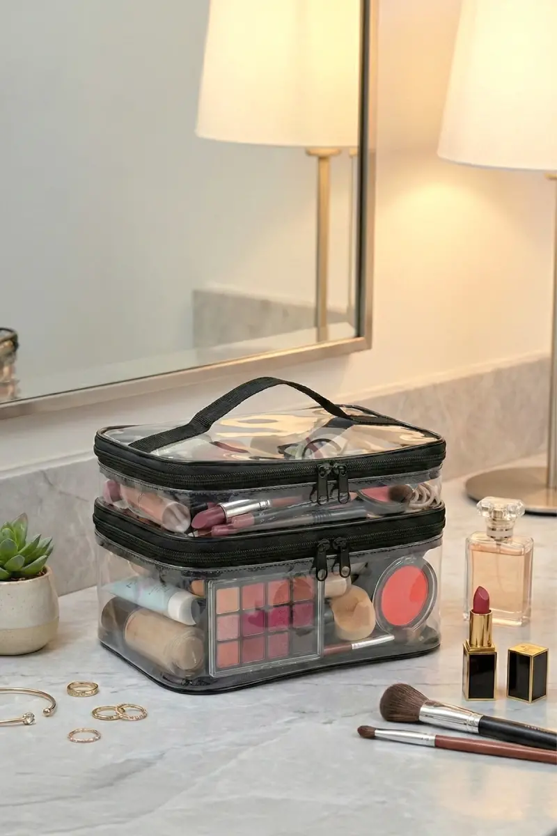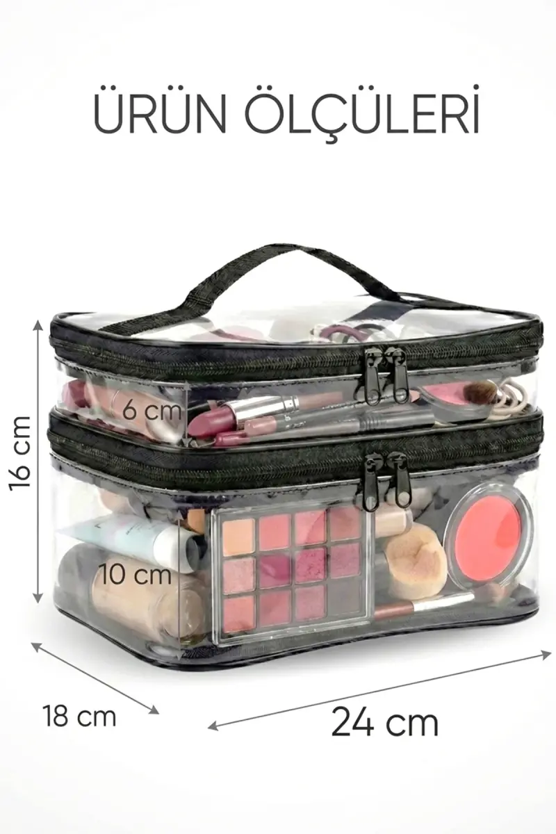 Kadın Makyaj Çantası Iki Geniş Bölmeli Askılı Katlanabilir Bakım Seyahat Organizer Makyaj Çantası-Şeffaf