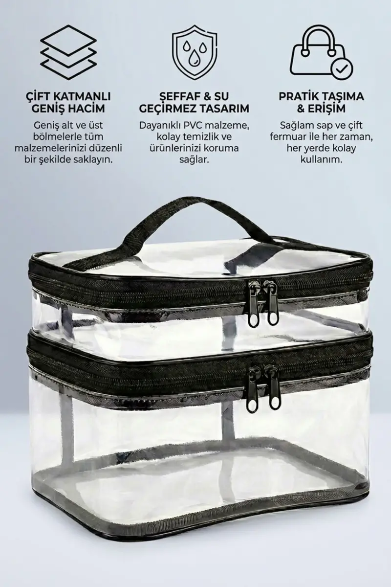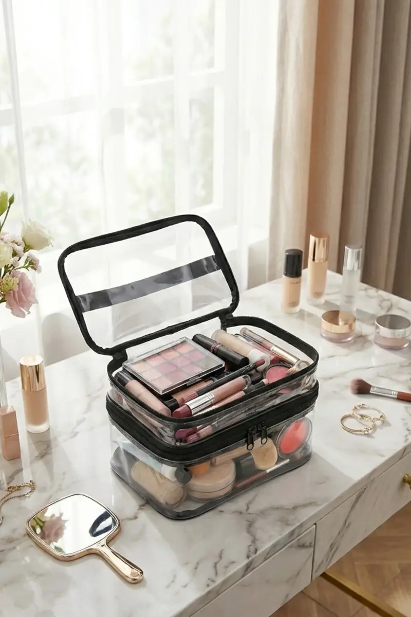 Bu ürün AYACO TREND tarafından gönderilecektir.Kampanya fiyatından satılmak üzere 100 adetten fazla stok sunulmuştur.İncelemiş olduğunuz ürünün satış fiyatını satıcı belirlemektedir.Bir ürün, birden fazla satıcı tarafından satılabilir. Birden fazla satıcı tarafından satışa sunulan ürünlerin satıcıları ürün için belirledikleri fiyata, satıcı puanlarına, teslimat statülerine, ürünlerdeki promosyonlara, kargonun bedava olup olmamasına ve ürünlerin hızlı teslimat ile teslim edilip edilememesine, ürünlerin stok ve kategorileri bilgilerine göre sıralanmaktadır.Bu üründen en fazla 20 adet sipariş verilebilir. 20 adedin üzerindeki siparişleri Trendyol iptal etme hakkını saklı tutar. Belirlenen bu limit kurumsal siparişlerde geçerli olmayıp, kurumsal siparişler için farklı limitler belirlenebilmektedir.15 gün içinde ücretsiz iade. Detaylı bilgi için [page="return_conditions"]tıklayın .İKİ AYRI BÖLME: Alt ve üst olmak üzere iki fermuarlı bölmesi sayesinde büyük boy makyaj çantası ürünümüz günlük makyaj ürünleri ve cilt bakım ürünlerini karıştırmadan düzenli şekilde saklamanızı sağlar.TAM ŞEFFAF TASARIM: Makyaj düzenleyici ürünümüz şeffaf PVC yapısı sayesinde çantayı açmadan içindekileri net şekilde görebilir, zamandan tasarruf edersiniz.KALIN VE DAYANIKLI PVC: İnce poşet hissi vermez, formunu koruyan kalın PVC yapısı ile uzun süreli kullanım sunar.SEYAHATE UYGUN: Seyahat makyaj çantası valizde, çantada veya banyo rafında devrilmeden durur, taşıma sırasında ürünlerin dağılmasını önler.FERMUARLI VE GÜVENLİ KAPANMA: Her iki bölmede bulunan sağlam fermuarlar sayesinde makyaj malzemeleri güvenle taşınır.KOLAY TEMİZLENİR: Suya dayanıklı yüzeyi sayesinde nemli bir bezle kolayca temizlenir, leke tutmaz.GÜNLÜK VE SEYAHAT KULLANIMINA UYGUN: Makyaj organizer ürünümüz evde düzenleyici olarak veya seyahatlerde makyaj çantası olarak rahatlıkla kullanılabilir.HAFİF AMA HACİMLİ TASARIM: Makyaj saklama çantası ağırlık yapmadan birçok makyaj ve bakım ürününü aynı anda taşımanıza olanak tanır.KADIN KULLANIMINA UYGUN FONKSİYONEL TASARIM: Kozmetik çantası ürünümüz fondöten, ruj, rimel, palet, sünger ve fırçalar için ideal iç hacim sunar.ŞIK VE SADE GÖRÜNÜM: Suya dayanıklı makyaj çantası ürünümüz minimal siyah detaylarıyla her tarz çanta ve valizle uyum sağlar.