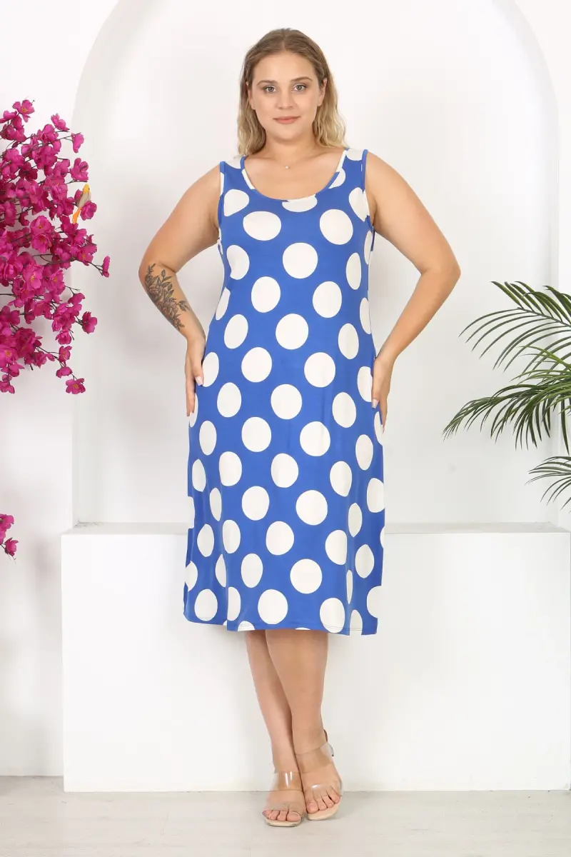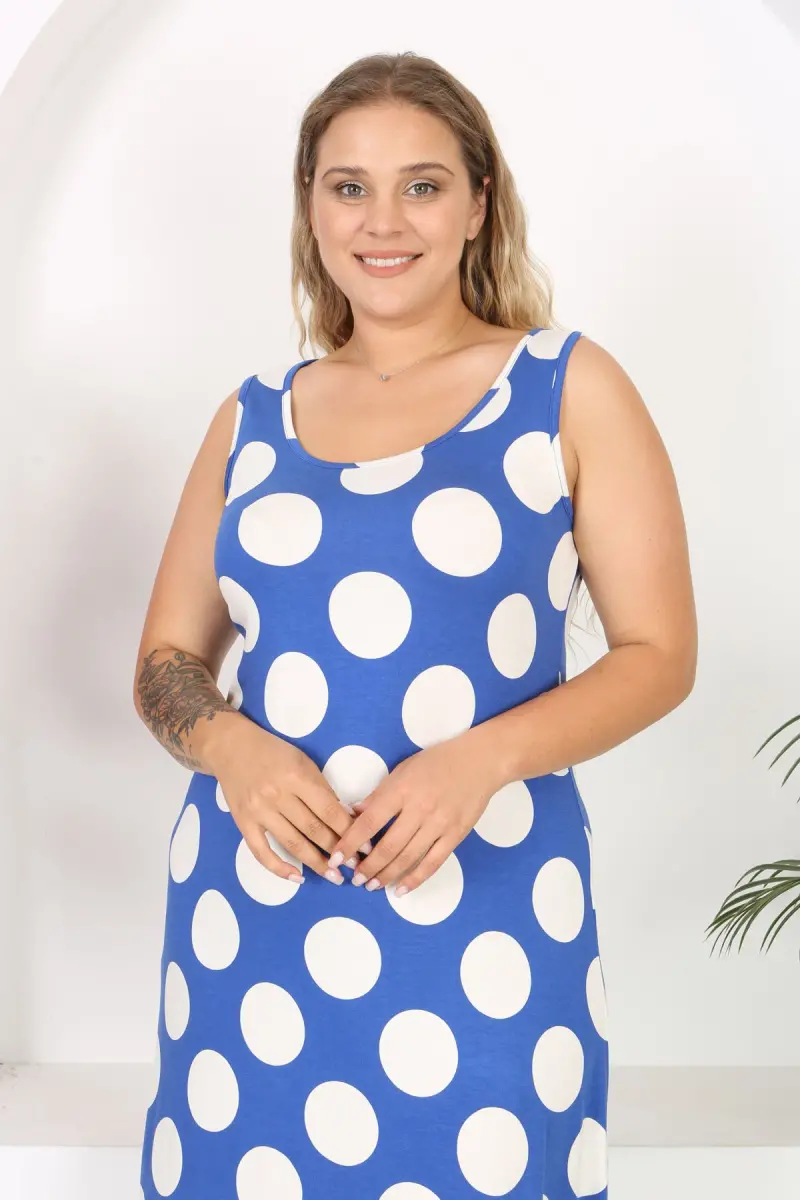 Kadın Mavi Beyaz Puantiye Desenli Büyük Beden Askılı Elbise-Mavi Beyaz Puantiye