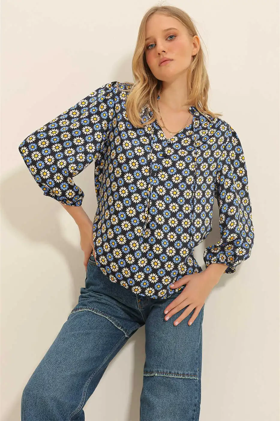 The blue mandarin collar and delicate floral print make the blouse stand out, while the button details complement its elegance. Ideal for everyday use, this blouse can be combined with jeans, skirts or shorts to create a modern and elegant look.