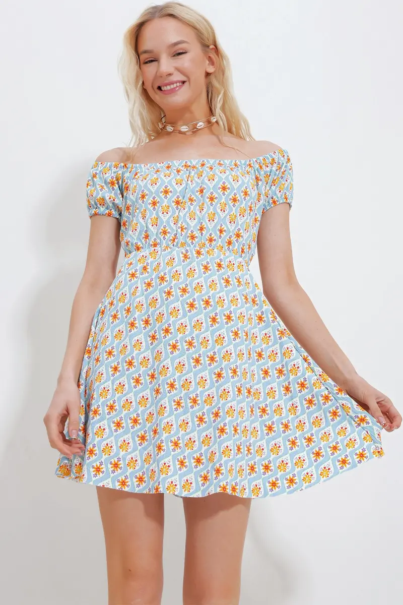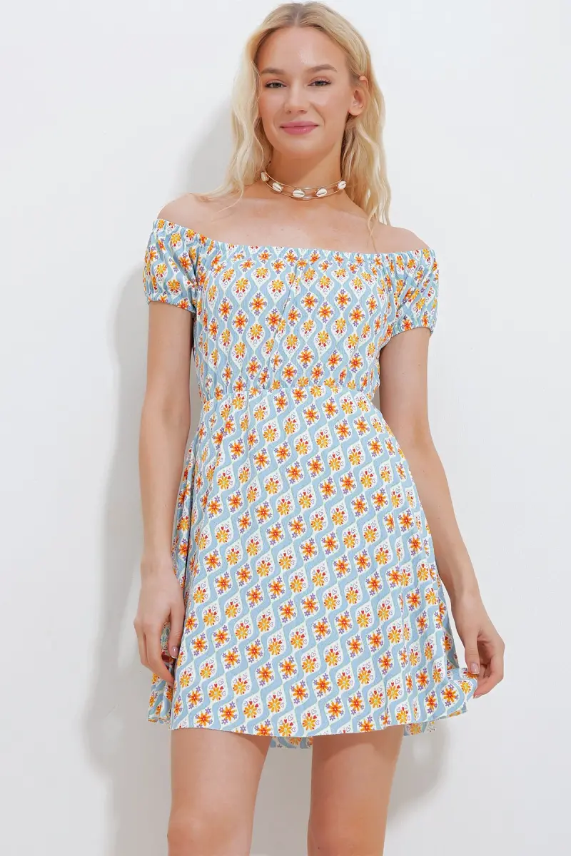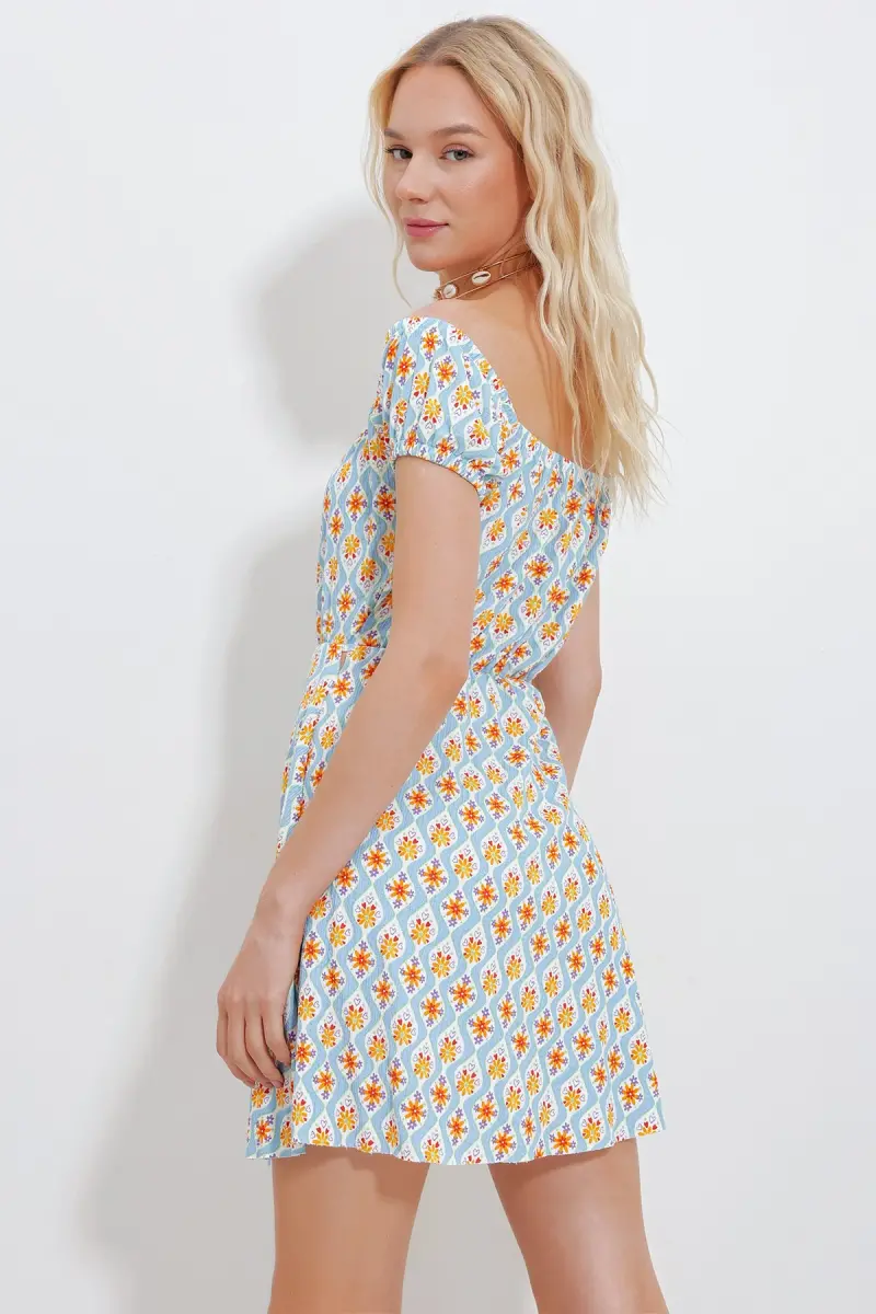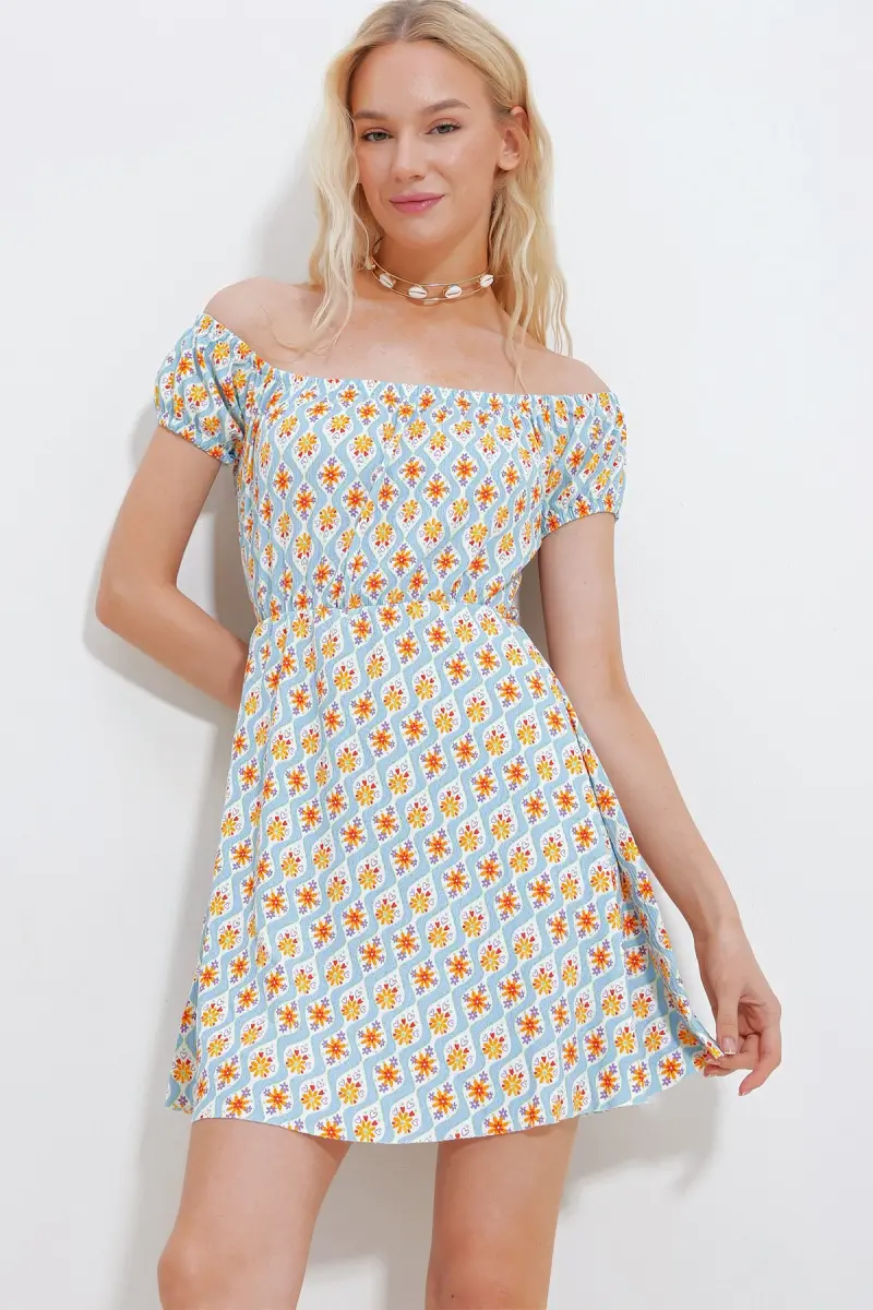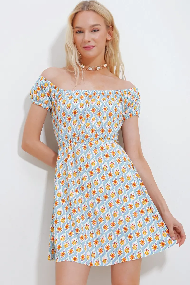Kadın Mavi-Turuncu Madonna Yaka Karpuz Kollu Desenli Krinkıl Örme Elbise Alc-X10516-MAVİ