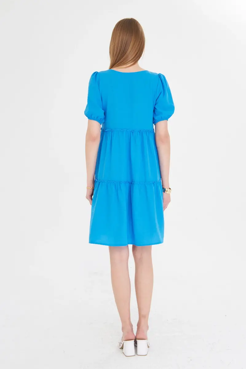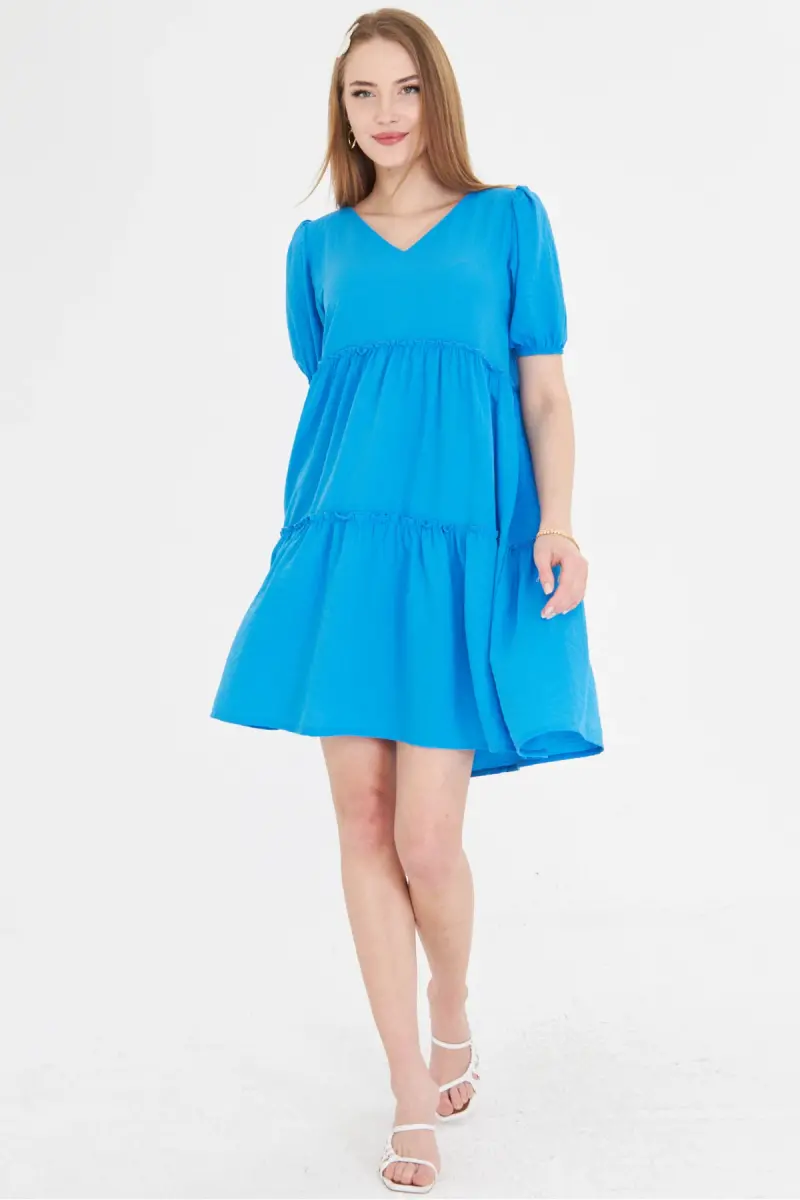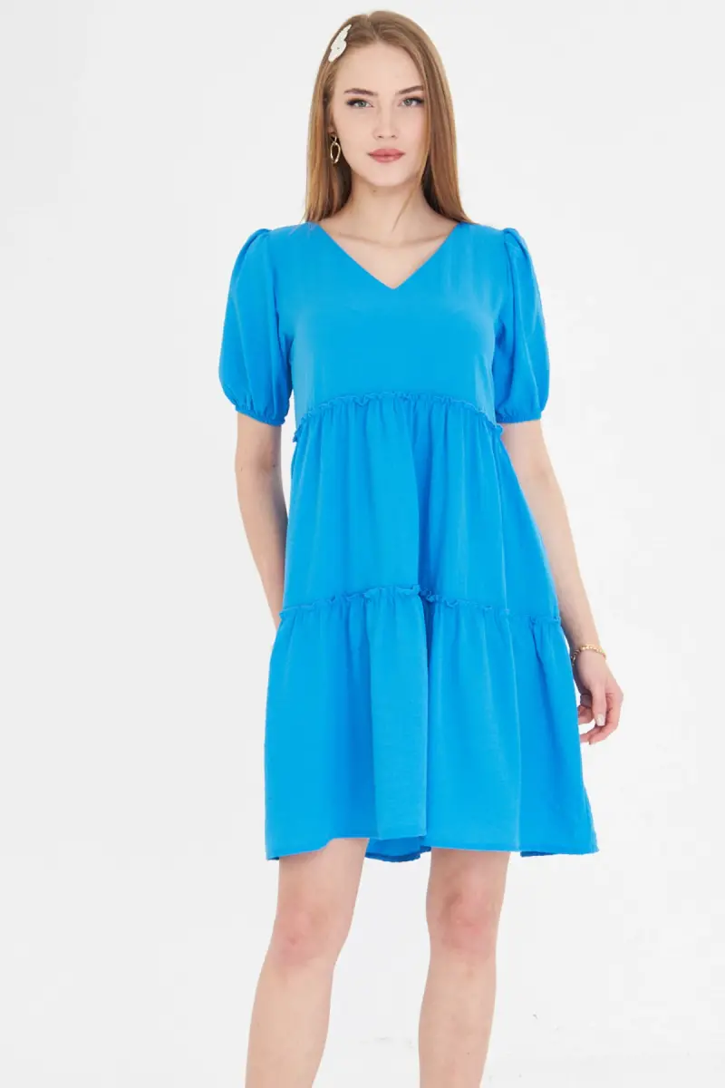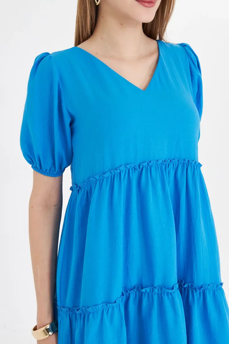 Kadın Mavi V Yaka Kısa Kol Fırfırlı Elbise ARM-25Y001049-Mavi