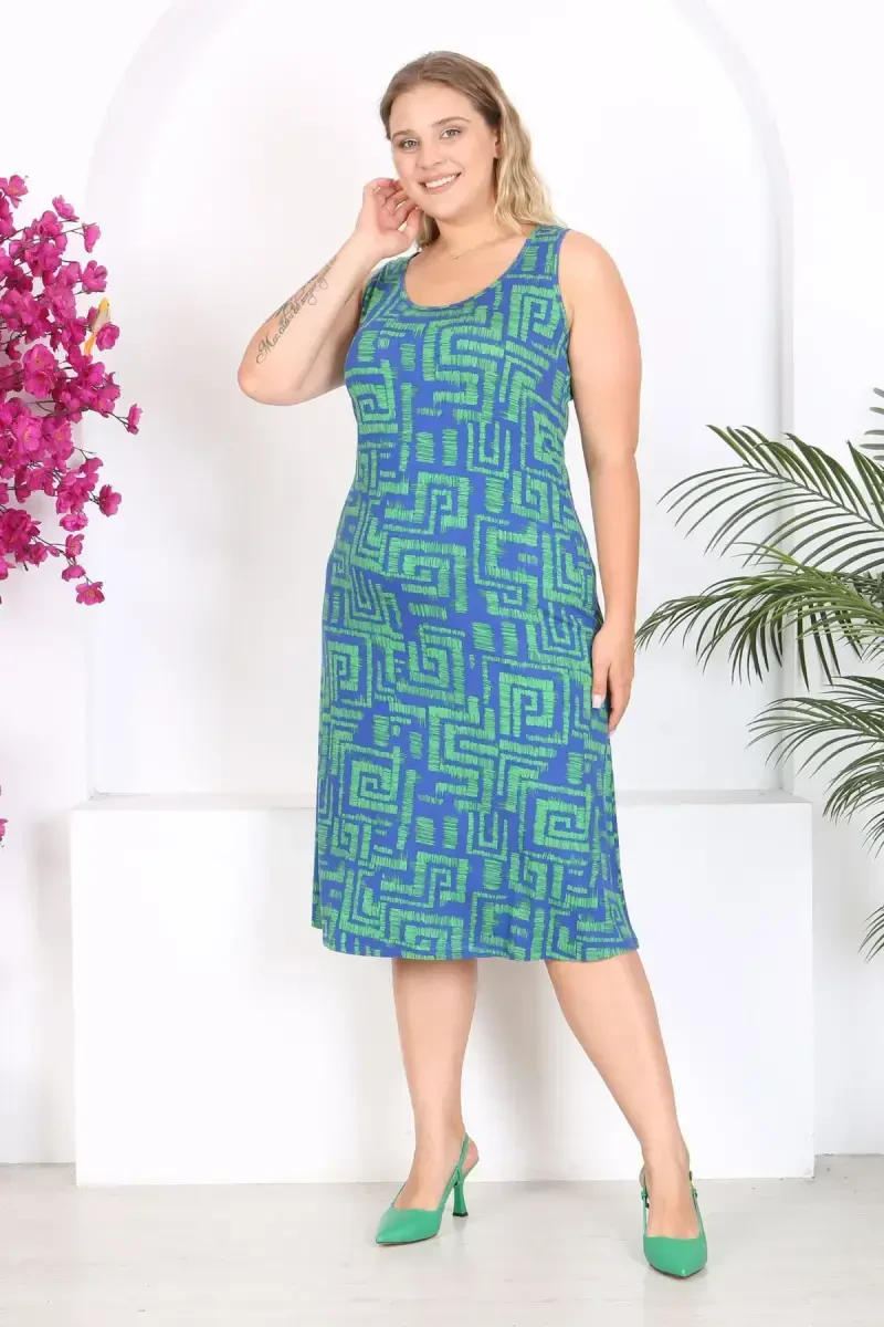 Women's Blue Green Maze Pattern Plus Size Sleeveless Dress, ready to be an indispensable part of your wardrobe with Madwilo assurance! This unique design combines both elegance and comfort, allowing you to attract attention in any environment. This dress, enlivened with a batik pattern, reflects the energy of summer with its vibrant blue and green tones, while its plus-size fit ensures a perfect fit for every body type. The midi-length cut is an ideal choice for both daily use and special occasions. Whether you're sunbathing on the beach or meeting friends in the city, you'll always look stylish in this dress. The U-neck design creates an elegant neckline, while the sleeveless arm length keeps you cool and airy in hot weather. The 95% viscose and 5% elastane blend fabric caresses your skin with its soft texture and offers comfortable wear all day long. Its flexible structure does not restrict your freedom of movement, while the A-line silhouette gently wraps your body lines to create a feminine look. This dress is not only stylish but also practical. You can easily clean it by washing it inside out at a maximum of 30°C. Whether you wash it by hand or in the machine, its colors and texture remain like the first day. Although designed as beachwear, it is a versatile piece that you can easily use in daily life. You can create different styles by combining it with sandals, slippers, or sneakers. Women's Blue Green Maze Pattern Plus Size Sleeveless Dress is not just a garment but also a lifestyle. It makes you feel good, increases your self-confidence, and allows you to enjoy every moment. Get ready to collect the most beautiful memories of summer with this dress!
